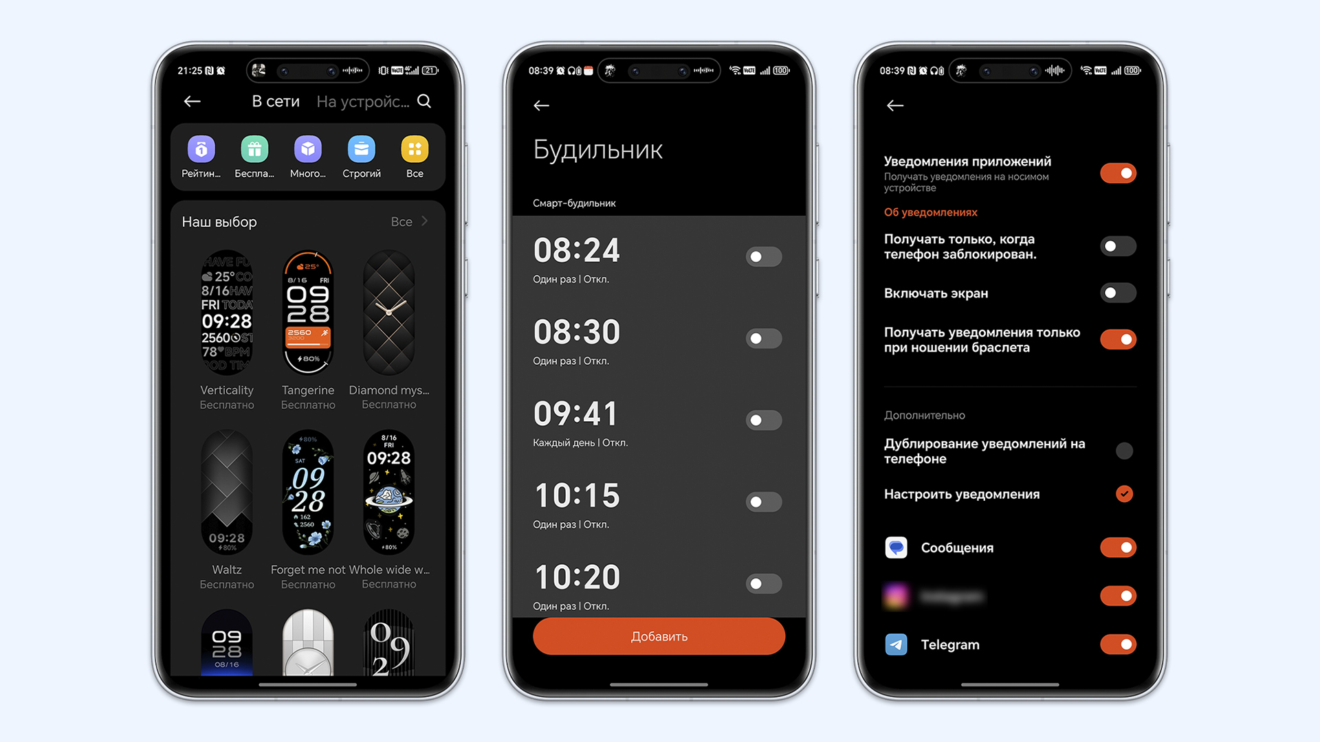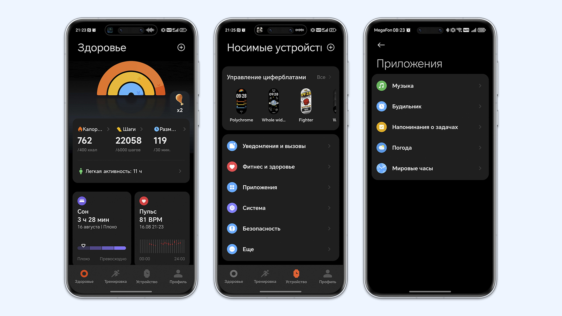 Помимо прочего, через приложение можно выбирать и менять обои, включать будильники, а также управлять режимами тренировок. Это даёт возможность адаптировать устройство под свои потребности и предпочтения. Хотите видеть на экране только шаги и время? Пожалуйста. Нужны уведомления только от определённых приложений? Без проблем.