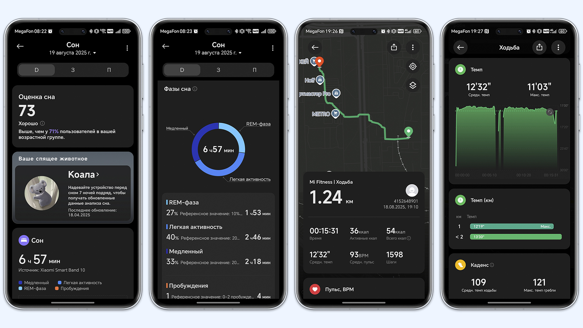 К качеству сбора данных нареканий в целом нет. Браслет и приложение следят за количеством шагов и калорий, могут постоянно мониторить пульс и уровень кислорода в крови, уровень стресса, а также отслеживать качество сна, показывая его фазы: медленный, лёгкий и быстрый (REM-фаза) сон. Данные собираются достаточно точно, хотя о профессиональном отслеживании каденса, времени нахождения в воздухе и синхронизацией со Strava при беге речи не идёт — это всё-таки фитнес-браслет, а не профессиональные спортивные часы.