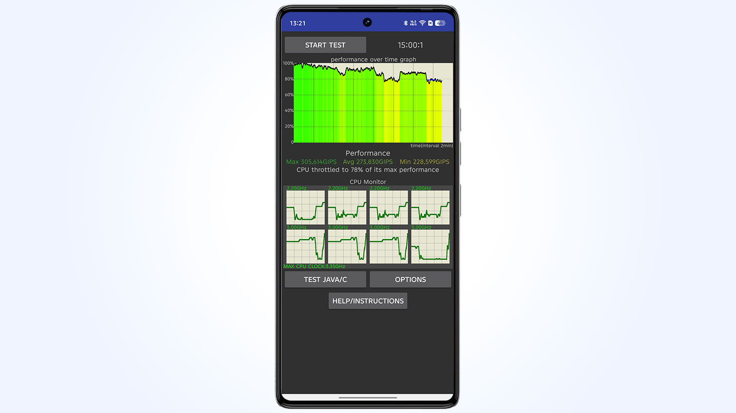 Следующая проверка — в приложении CPU Throttling Test, которое показывает, как ведёт себя смартфон под нагрузкой. Tecno Pova 7 Ultra 5G нагревается и теряет производительность в этом бенчмарке, однако потеря мощности не критичная, поведение предсказуемое для этого процессора. Для продолжительных игровых сессий смартфон подходит хорошо.