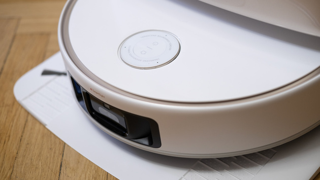 У пылесоса классический круглый корпус, а сверху расположен лидар для навигации. Однако здесь он непростой — датчик автоматически поднимается, когда робот находится на открытом пространстве, и убирается, когда гаджету необходимо маневрировать в условиях ограниченного по высоте пространства. Например, если нужно заехать под диван или шкаф.