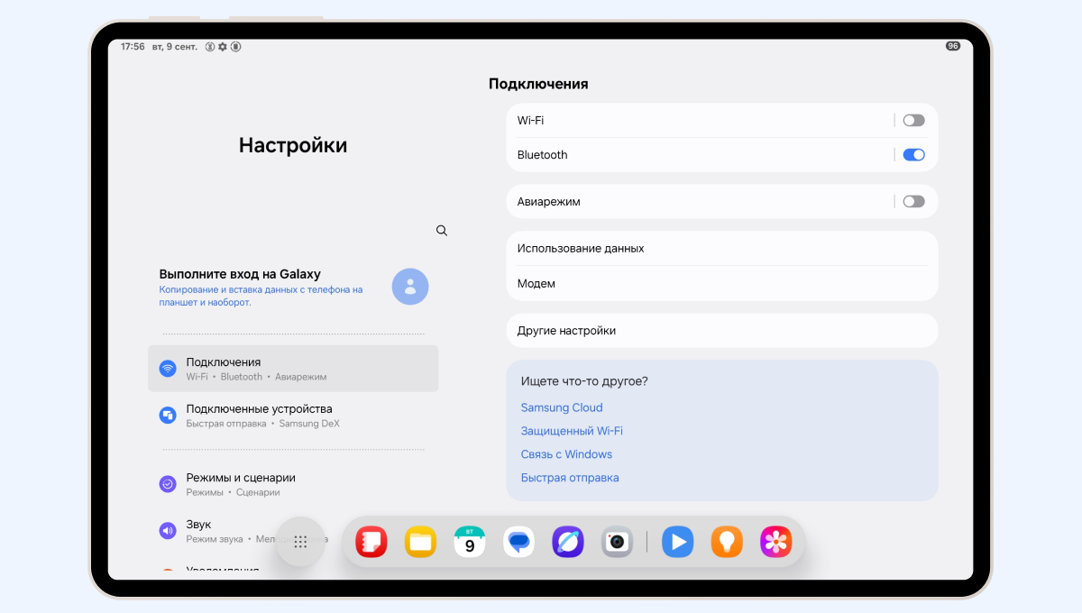 Интерфейс OneUI неоднократно описывали в обзорах «Рамблер Технологий» — это удобная оболочка с минимумом постороннего софта (кроме экосистемы Samsung), наглядными иконками, отсутствием навязчивой рекламы и логичным расположением настроек. Здесь она дополнительно оптимизирована под планшетный режим. Например, меню настроек разделено на две части, а свайп снизу открывает удобную панель с недавно запущенными приложениями: