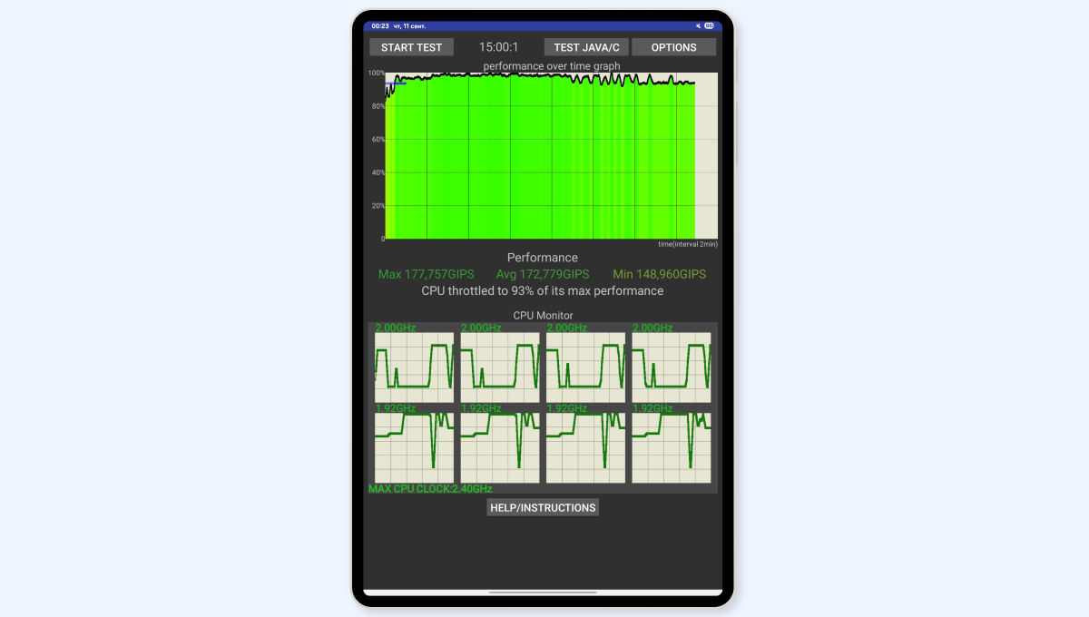Затем я протестировала планшет Samsung в CPU Throttling Test. Эта утилита нагружает процессор и демонстрирует, как ведёт себя устройство при стрессовых сценариях. Как показал тест, Galaxy Tab S10 Lite практически не подвержен троттлингу, не перегревается и не теряет в мощности. Это заслуга не только процессора, но и крупного металлического корпуса, который эффективно рассеивает тепло.