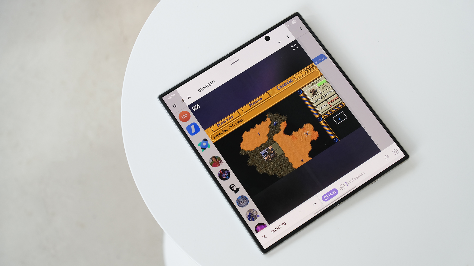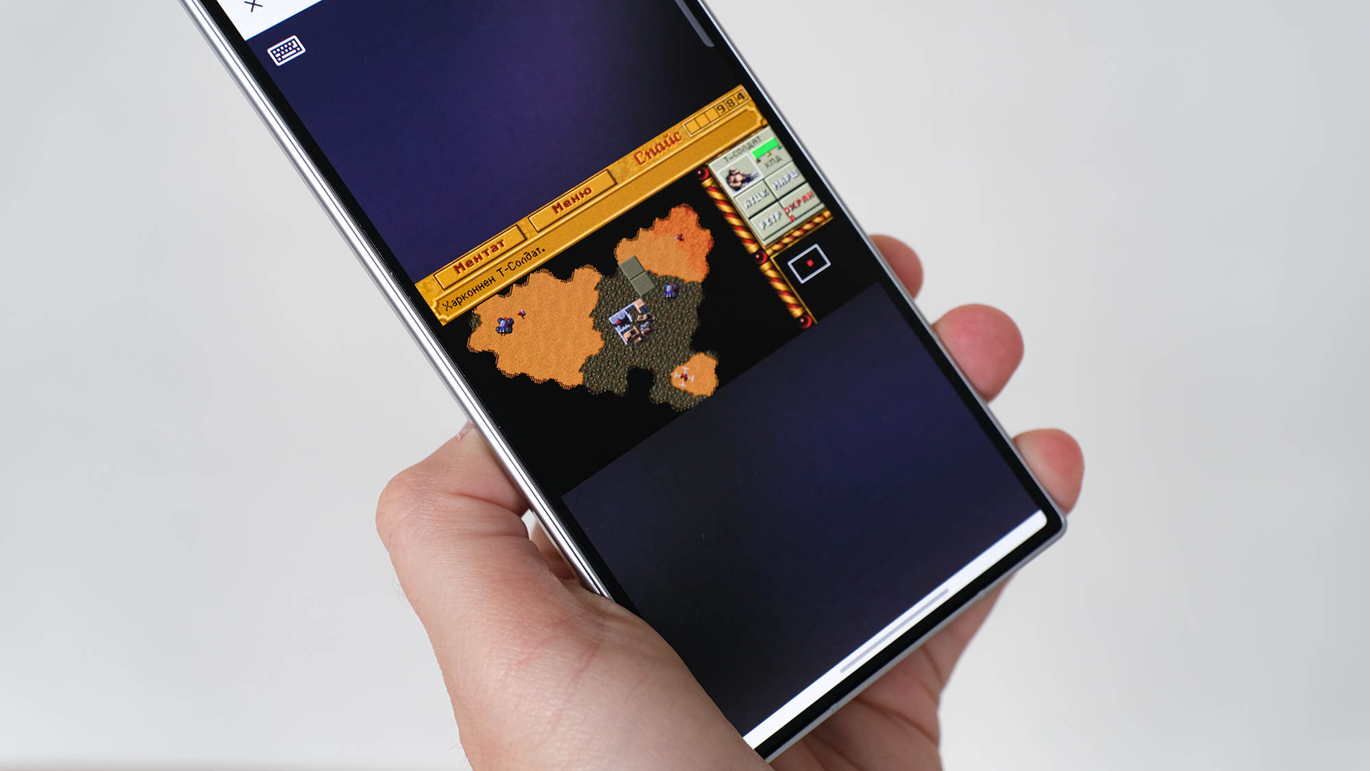 Внутренний 8-дюймовый экран не позволяет развернуть игру на всю площадь: поддержка full screen есть в описании игры, но работает она только с внешним дисплеем или на смартфонах-моноблоках. Казалось бы, это делает второй экран неудобным, но на практике получилось точно наоборот. Если у вас складной смартфон, я советую запускать Dune II именно так, как на этой фотографии: