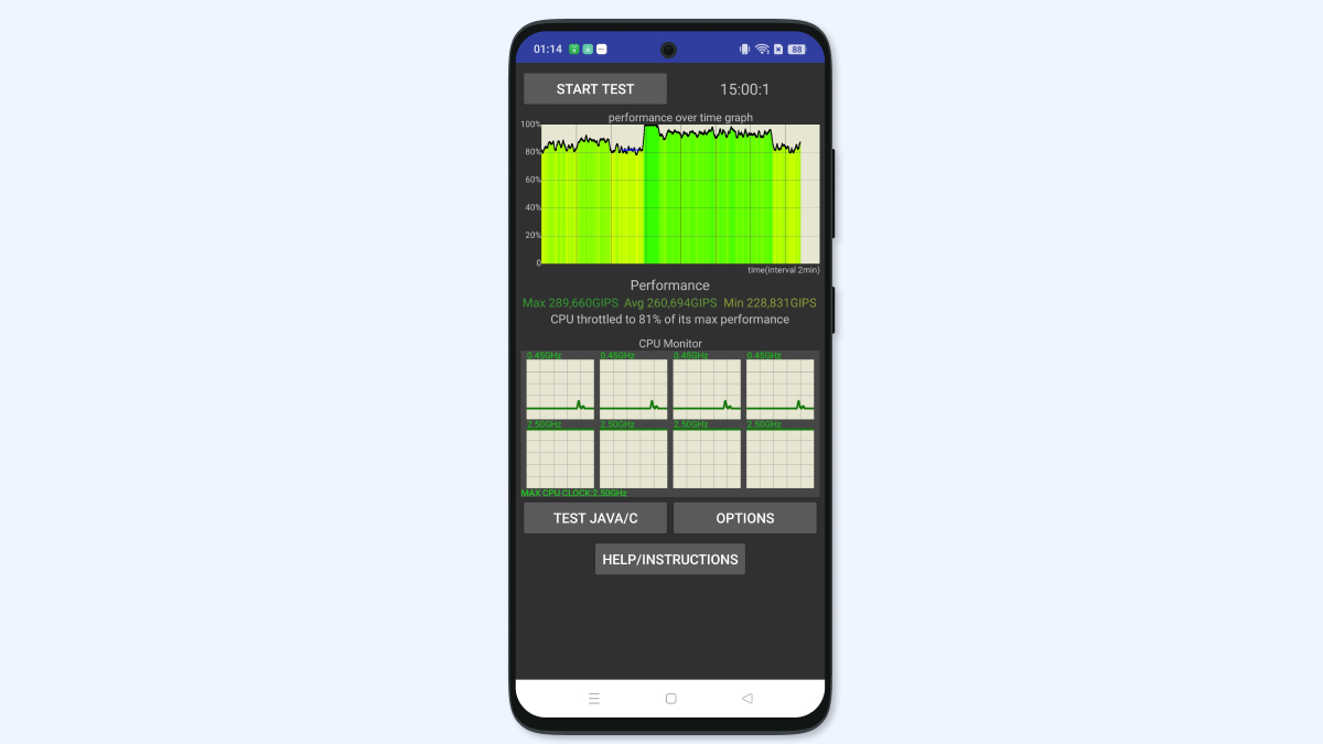 Также я оценил Realme 15 5G в синтетическом тесте CPU Throttling Test — он демонстрирует поведение смартфона под нагрузкой. Просадки производительности имеются, однако снижение мощности относительно небольшое. График не становится угрожающе красным, а шкала не пугает резкими взлётами и падениями. Троттлинг под нагрузкой у аппарата умеренный и вряд ли будет мешать вам в играх.