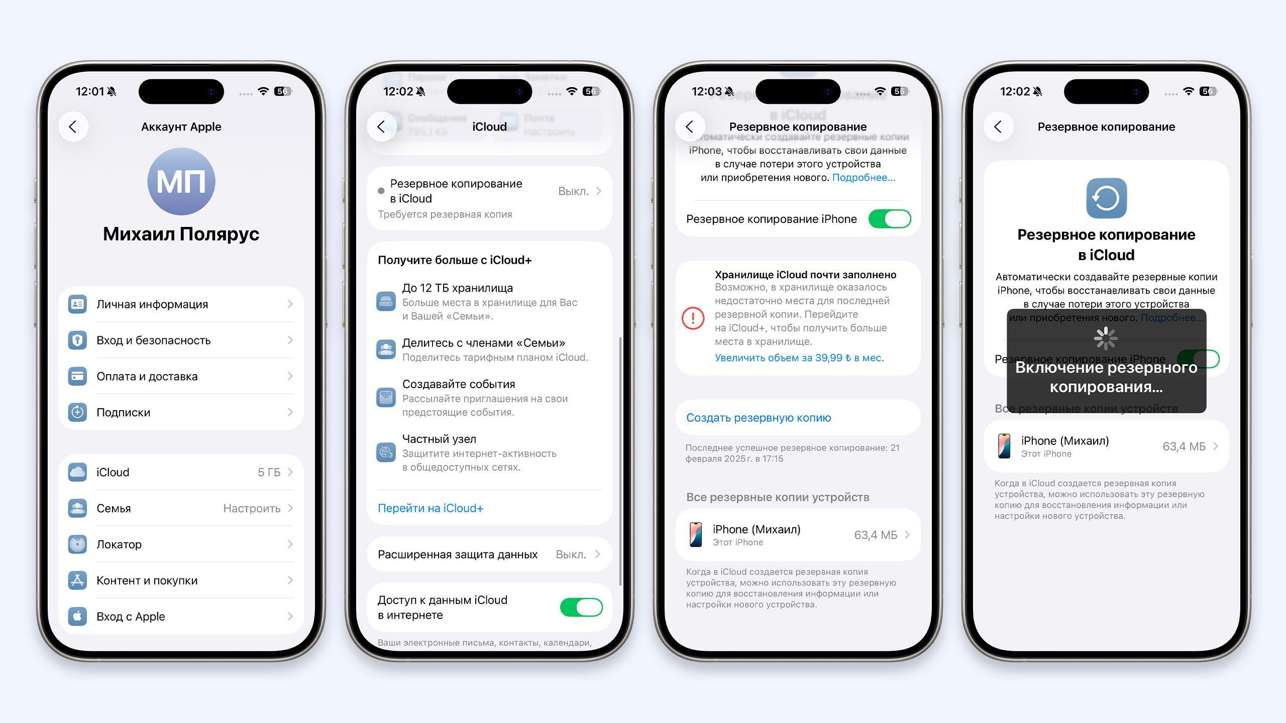 Как включить резервное копирование в iCloud. Перейдите в настройки → iCloud → пролистайте вниз до пункта «Резервное копирование в iCloud» и включите его. Вернитесь назад на прошлый экран и создайте резервную копию.