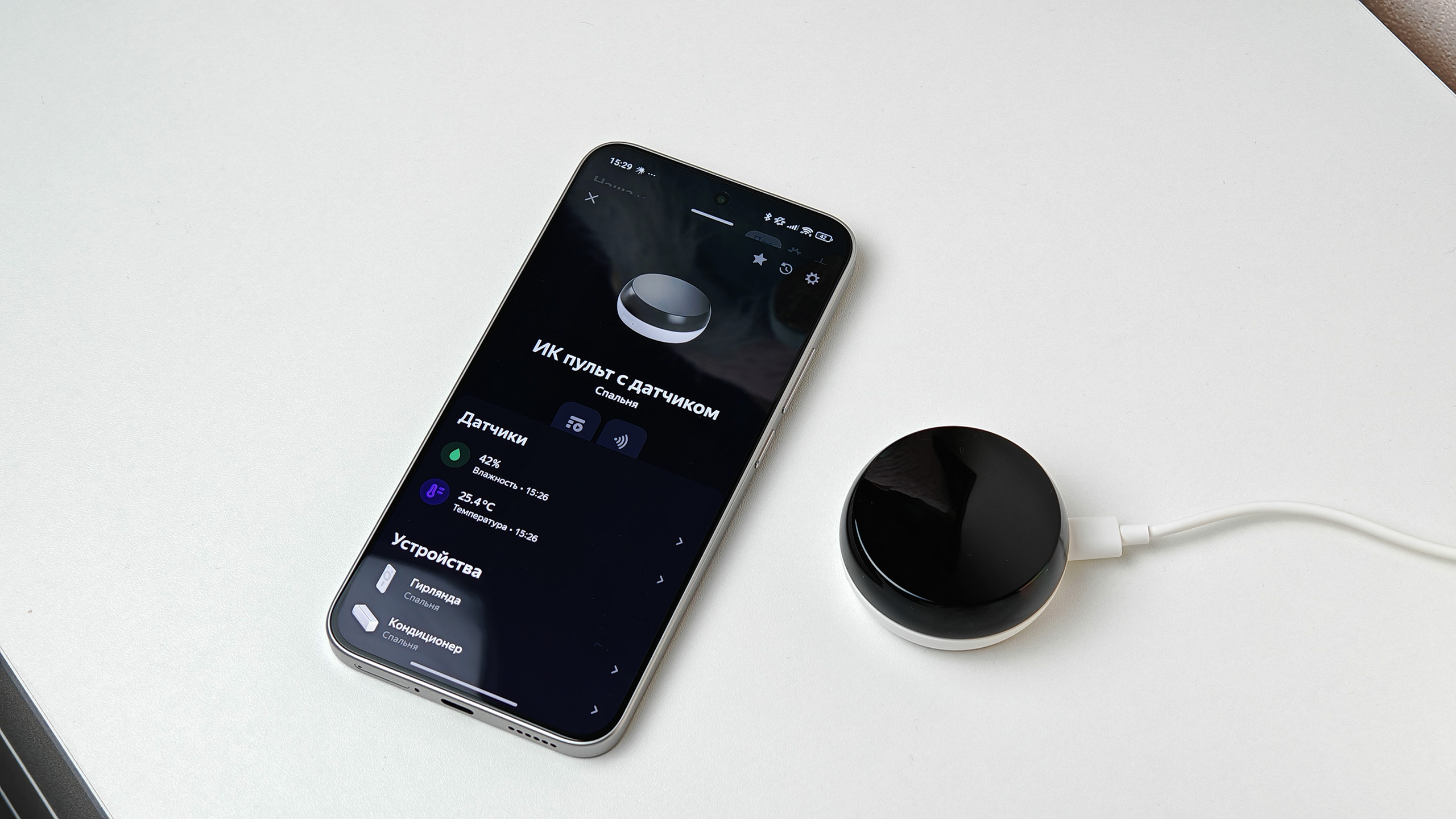Есть пара моментов, к которым можно придраться. Например, нет встроенного аккумулятора — пульту постоянно нужно питание от сети. Также нет дисплея, хотя датчик температуры и влажности встроен. Каждый раз спрашивать у Алисы, сколько градусов в спальне, или открывать приложение — не самый удобный вариант, особенно если пульт перед глазами. В остальном к качеству и работе устройства вопросов нет.