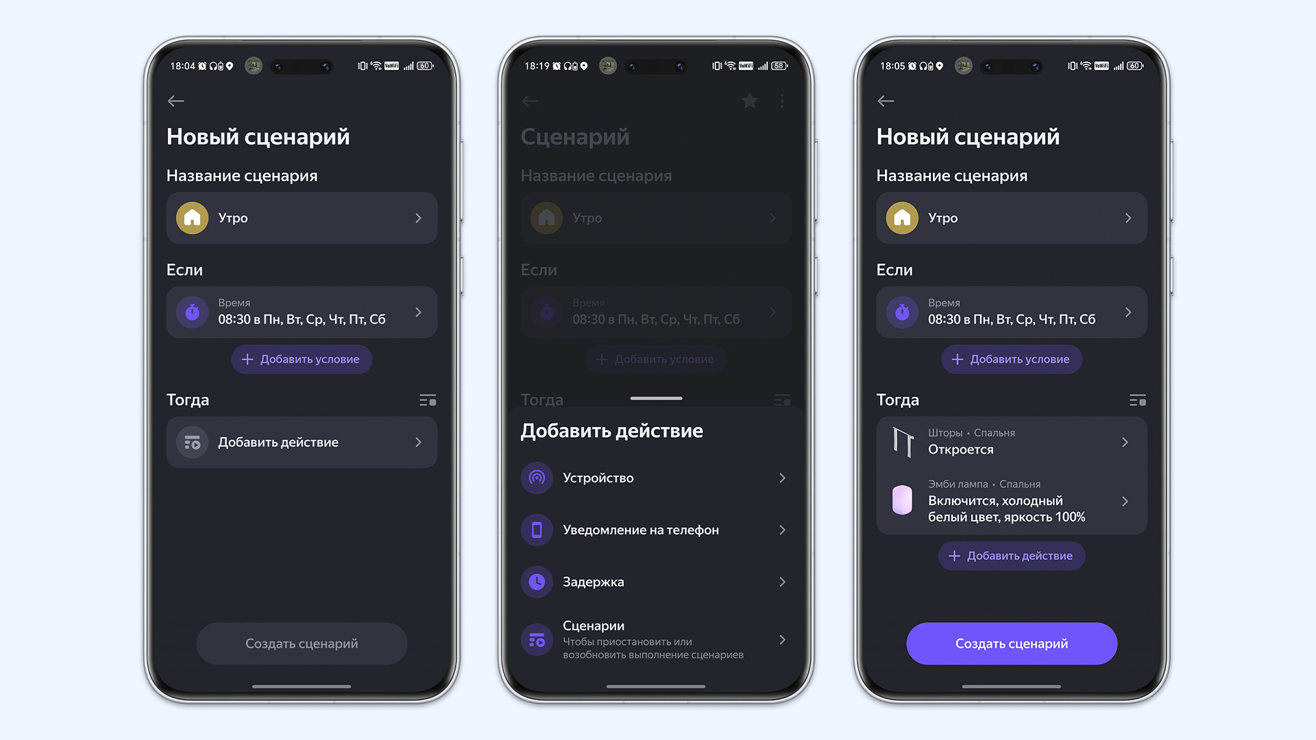 В приложении можно задать сценарий по будильнику — пожалуй, это самая полезная функция. Если вам тяжело вставать, карниз помогает: я поставил расписание, чтобы по будням шторы открывались в 8:30 утра. В сочетании с будильником получается отличный дуэт — просыпаешься, видишь дневной свет, и легче подняться.