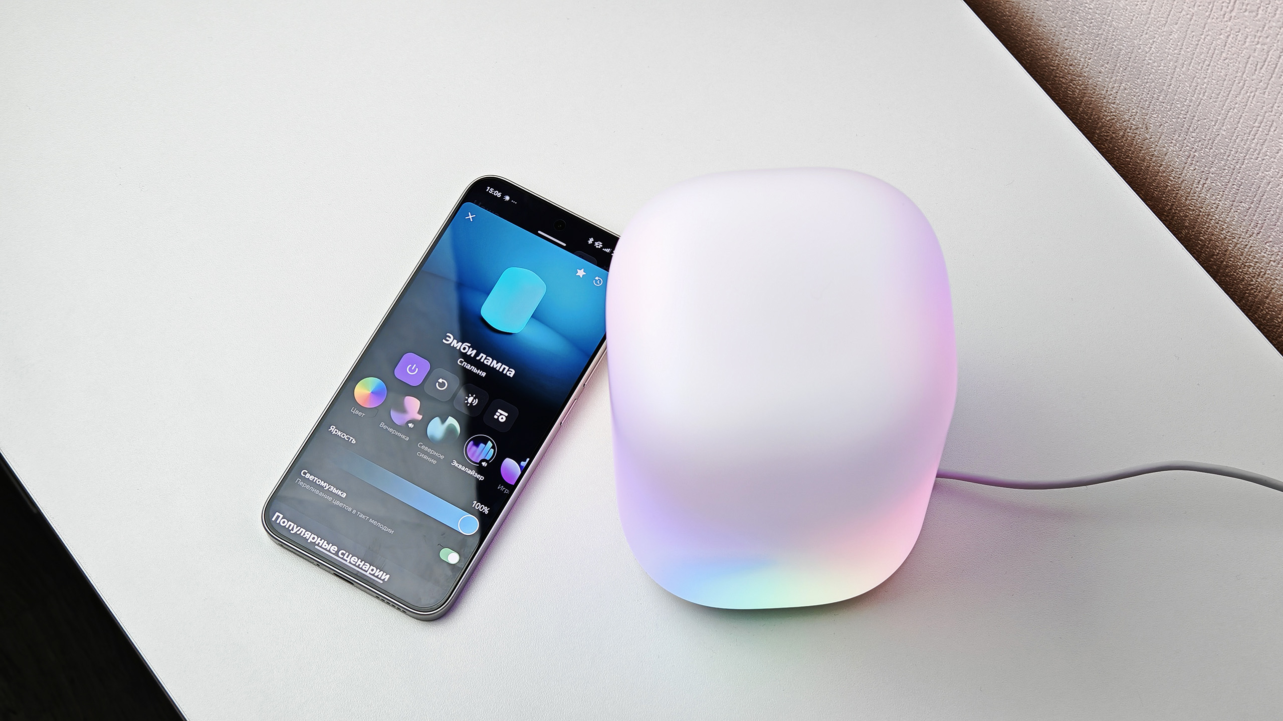 За новомодным названием скрывается умный RGB-светильник. Внутри, по данным Яндекса, установлено больше сотни независимых RGB-светодиодов. Благодаря им лампа работает как декоративный светильник для интерьера или как ночник. Как и другие устройства компании, эмби-лампа подключается к приложению «Дом с Алисой», через которое и управляется.