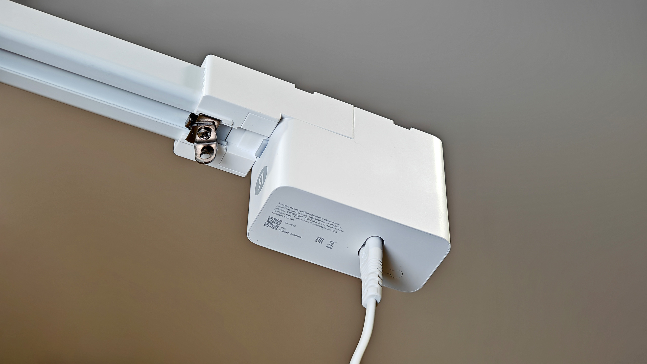 Теперь карниз можно вешать. Если заказываете устройство в фирменном магазине Яндекса, можно сразу заказать установку. Есть два варианта крепления — потолочное и настенное. Учитывайте, что мотор работает от сети 220 В. Комплектный провод короткий — 80 см, поэтому розетка должна быть почти у потолка. Можно использовать удлинитель, но он будет заметен. Либо можно заменить провод — коннектор здесь CEE 7/16. Яндекс официально это не рекомендует, но я попробовал — всё работает. Делайте на свой страх и риск.