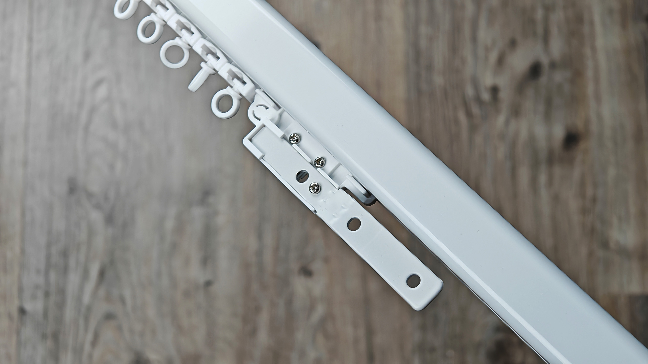 Затем ослабьте крепление каретки и разведите её к краям карниза, чтобы механизм работал корректно. После этого закрутите винты обратно. Далее установите шайбы и крепления, согласно инструкции из комплекта.