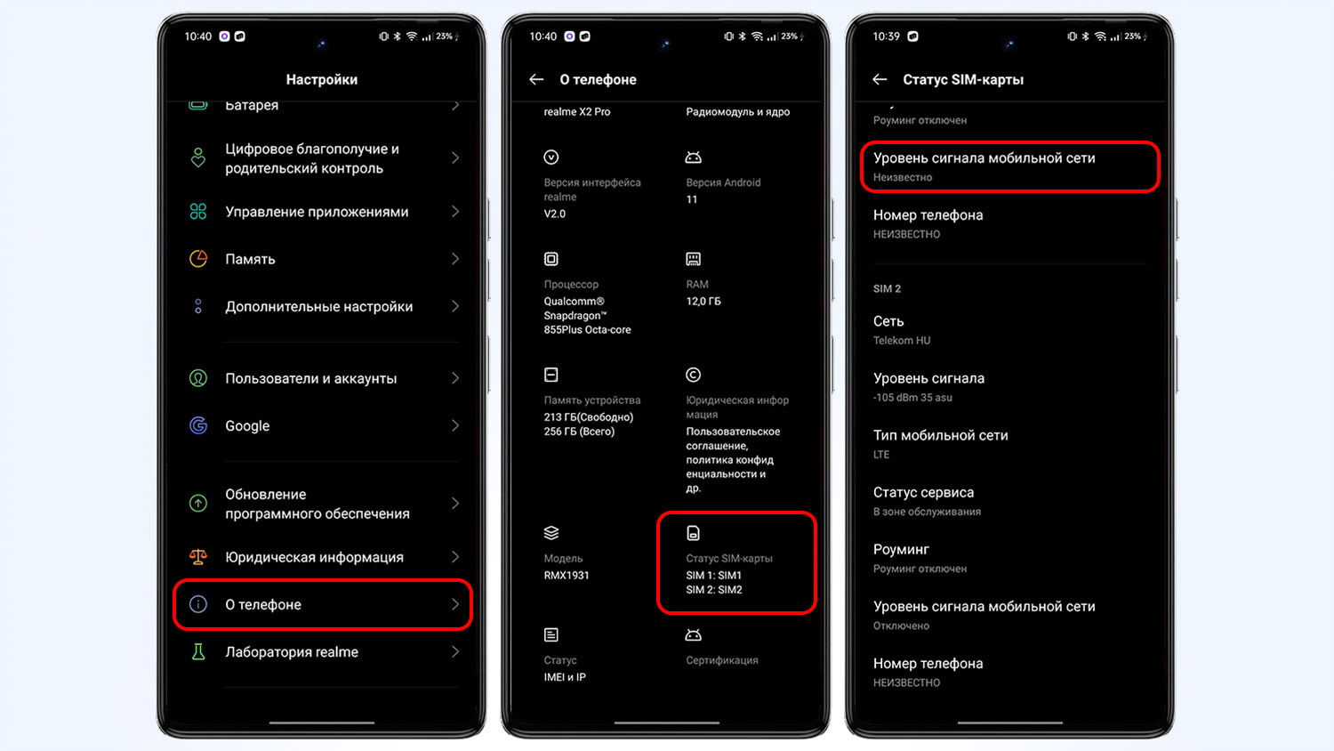 - В открывшемся меню вы увидите точное значение dBm в разделе «Уровень сигнала».
