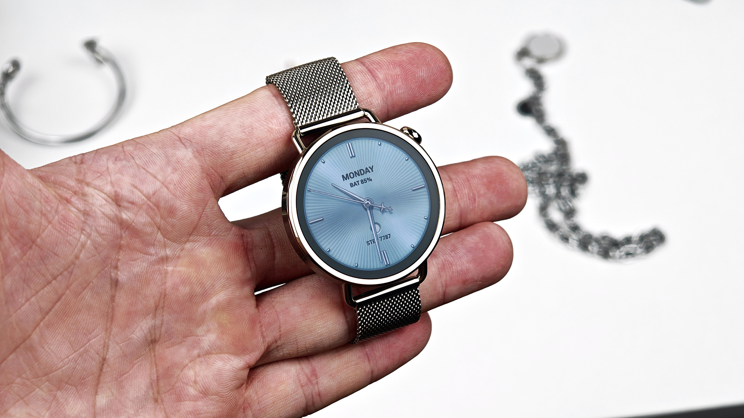 Несмотря на металлический корпус, часы нельзя назвать крупными: 41,2 × 41,2 × 9,5 мм и 32 г без ремешка (около 65 г с ним). Модель аккуратно смотрится и на женской, и на мужской руке, хотя на первой ощущается гармоничнее, причём как со строгим брючным костюмом, так и с домашними спортивными штанами и оверсайз худи.