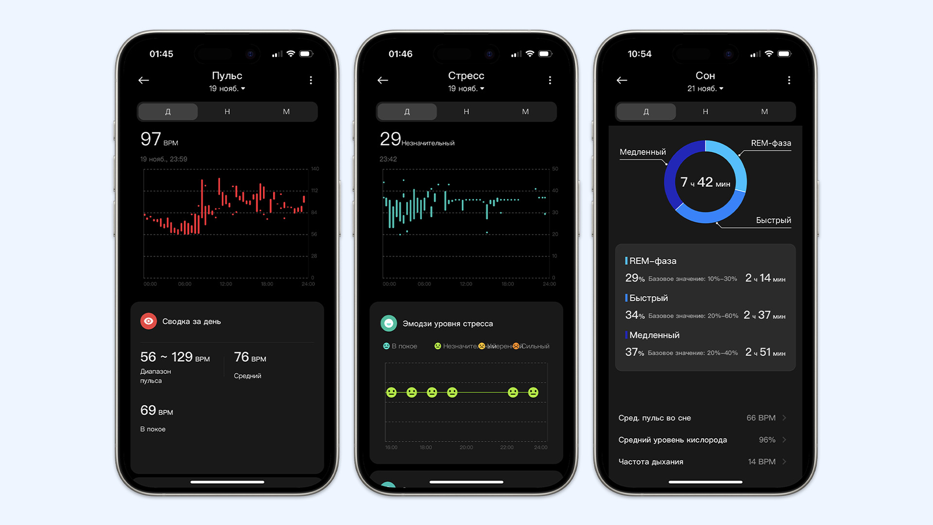 Показатели тоже читаются корректно. Сон отслеживается точно: часы фиксируют засыпание и подъём, даже если вы лишь на минуту проснулись — например, чтобы попить воды или освободить лапу кота, зацепившегося за когтеточку, — и снова уснули. Пульс и SpO2 измеряются стабильно — данных достаточно для ежедневного контроля самочувствия.