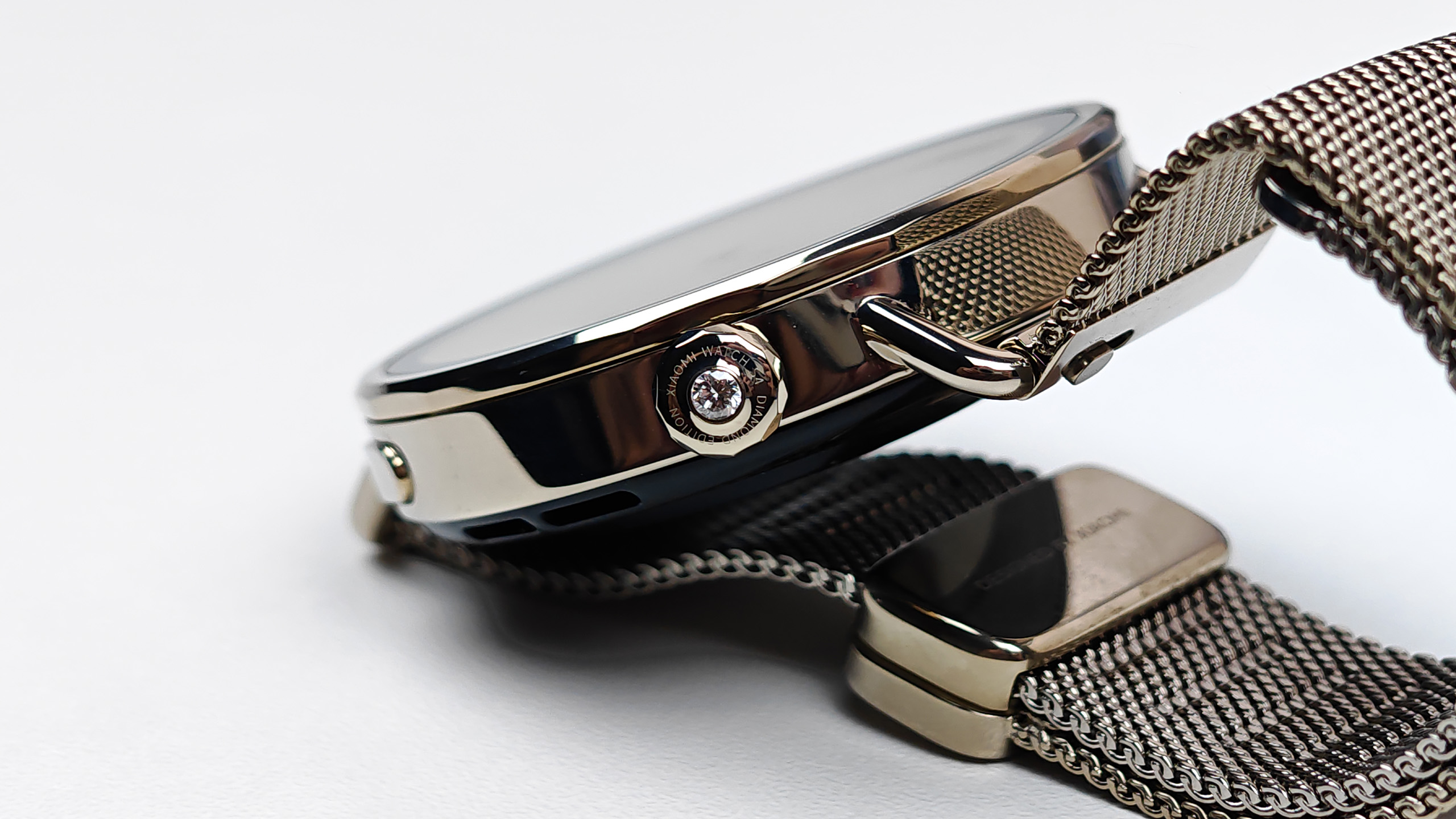 У нас на тесте лимитированная версия Xiaomi Watch S4 41 мм в оттенке «Золотой закат» (Sunset Gold) — тёплом, благородном и с лёгким блеском. Главный акцент — верхняя «заводная головка» с искусственным бриллиантом. Смотрится свежо и необычно, хотя из-за этого модель в золотом цвете стоит дороже остальных. Кроме неё ещё есть вариант в серебристом цвете с чёрным, белым или мятно-зелёным ремешками.