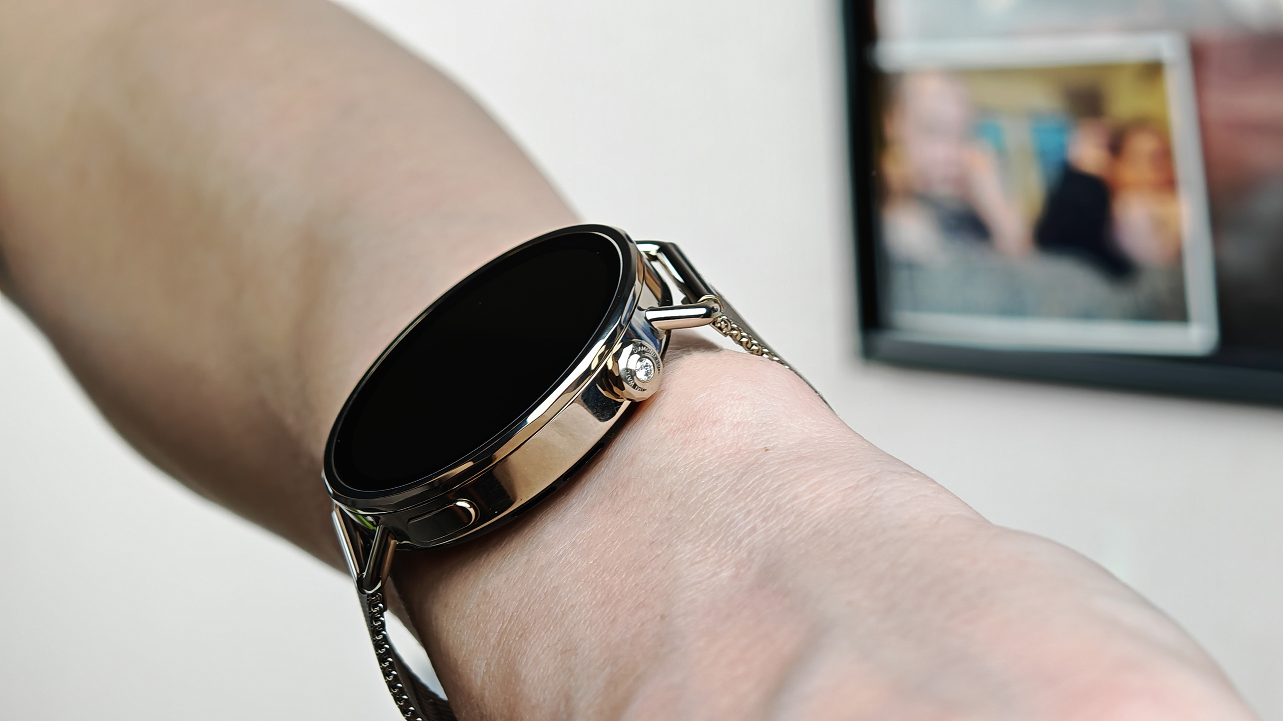 Дизайн часов близок к классическим наручным моделям — это удобно, если вы часто носите костюм или платье, а спортивный фитнес-трекер выбивается из такого образа. Минимализм прослеживается и в оформлении, и в количестве элементов на корпусе: справа установлена кнопка-колесико для прокрутки меню и пробуждения экрана, ниже — клавиша вызова панели управления.
