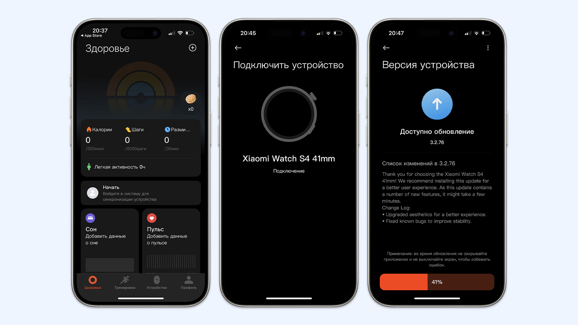 Чтобы подружить часы со смартфоном, понадобится приложение Mi Fitness — всё традиционно для экосистемы Xiaomi. Программа доступна для Android и iOS. Процесс простой: включите устройство, откройте скачанное приложение, предоставьте запрошенные разрешения, нажмите на плюсик в правом верхнем углу, создайте пару — готово. Затем часы обновятся, после чего их можно использовать. Но есть нюанс: в связке с iPhone обновление заняло больше часа — нетипично для носимых гаджетов. Это стоит учитывать, если планируете использовать модель с iOS сразу же после того, как достали из коробки.