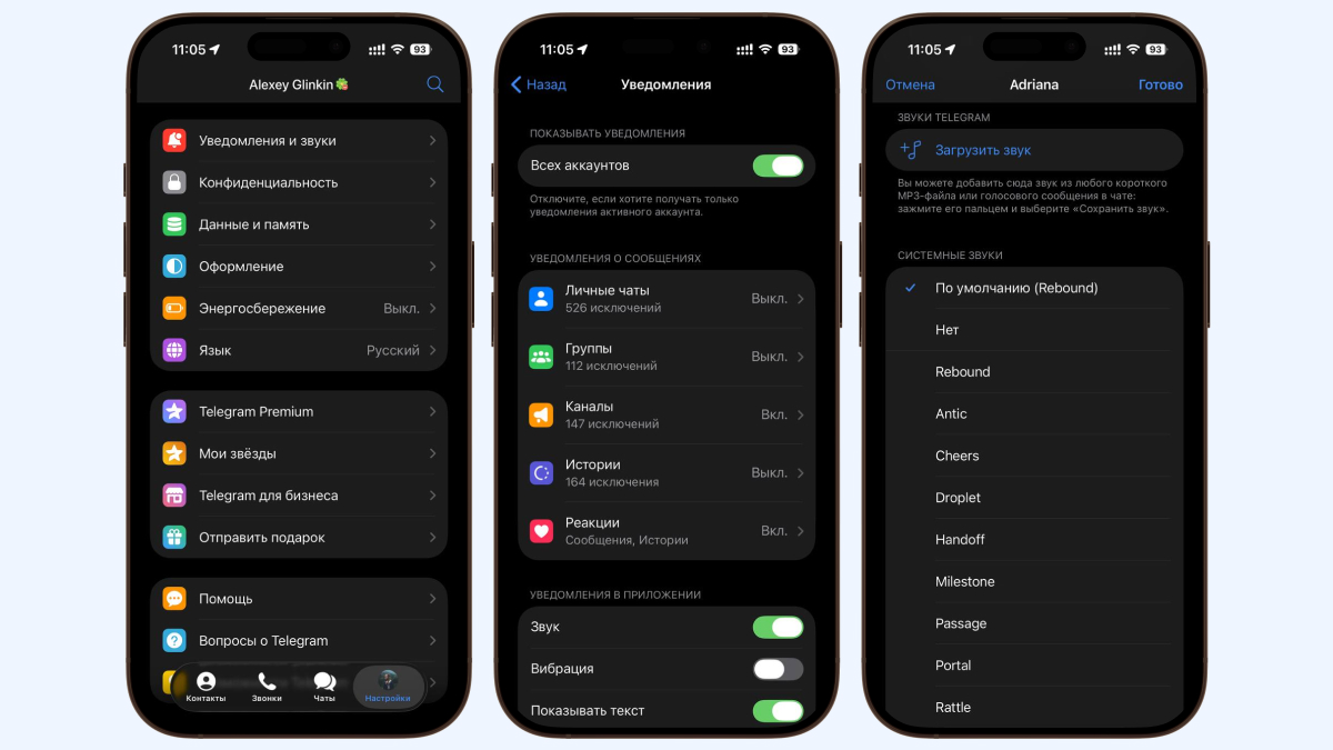 Откройте мессенджер на телефоне и зайдите в настройки (правая иконка с вашим аватаром в нижнем меню). Перейдите в раздел «Уведомления и звуки». Здесь вы можете выбрать сигналы для оповещения в личных чатах, группах, каналах, историях и реакциях. Причём мессенджер позволяет установить разные звуки для каждого варианта — например, чтобы вы без взгляда на экран определяли, откуда пришло сообщение.