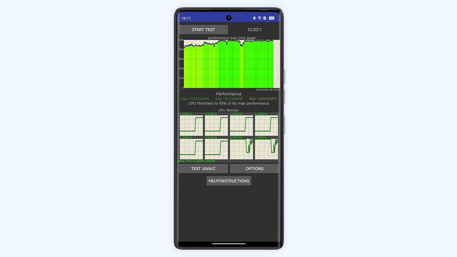 Я также протестировал смартфон на троттлинг, запустив утилиту CPU Throttling Test. Результат абсолютно предсказуемый для этого не самого мощного процессора: нагрев и снижение производительности под нагрузкой небольшие.