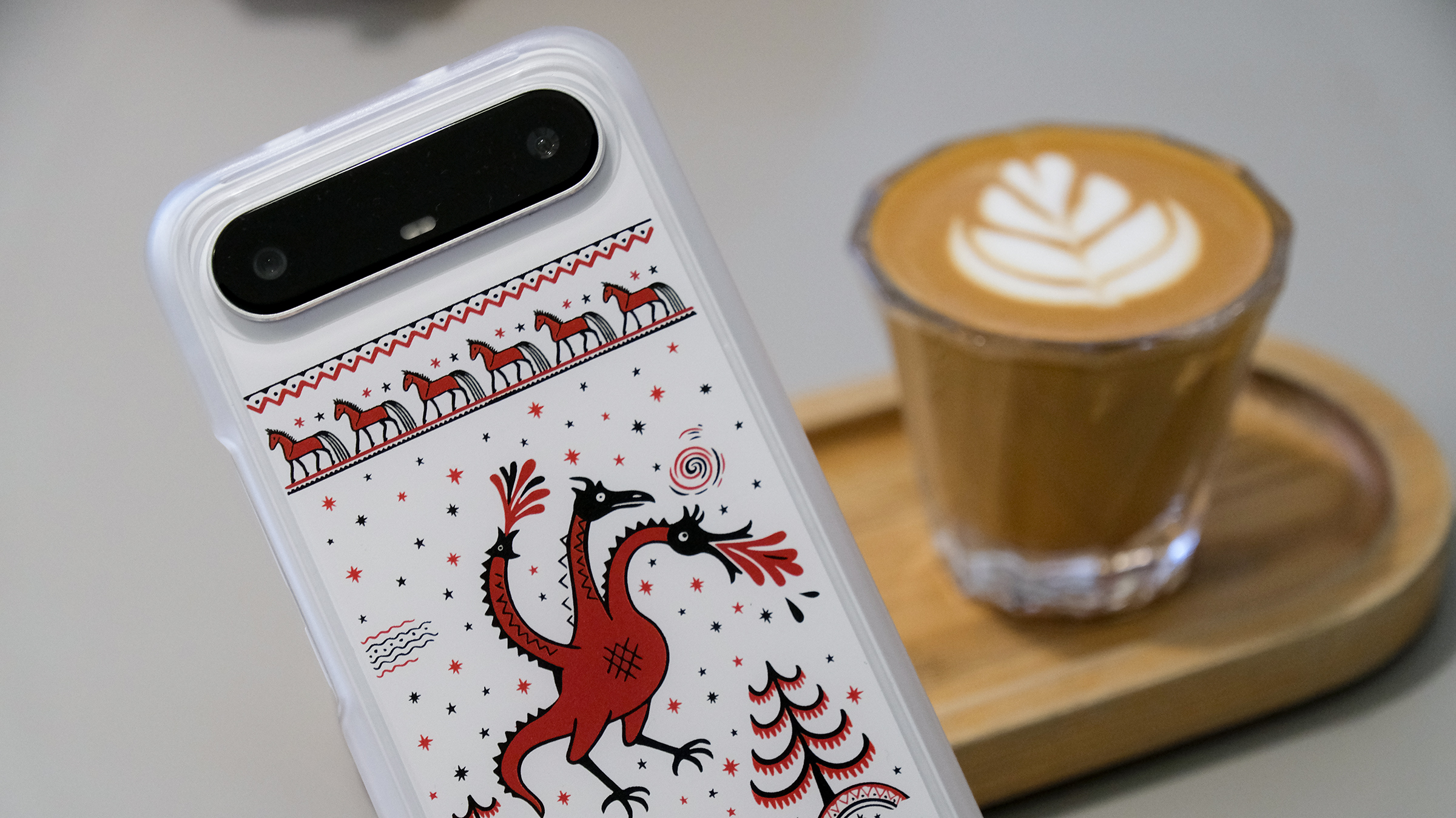Ещё одна забавная опция — фирменный чехол, который мне прислали вместе со смартфоном. Он отличается от комплектного необычной росписью. Дизайн был придуман в Tecno специально для России. Показываю, как это выглядит: