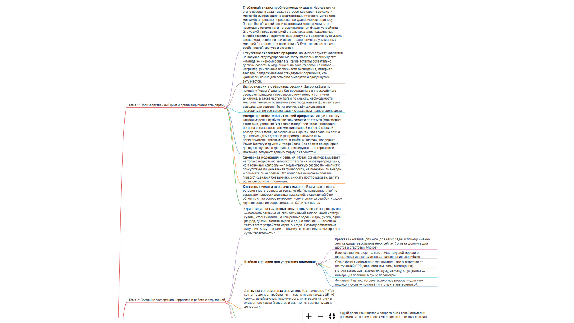 Ранее я пару раз пользовался сервисами для перевода речи в текст, но там не встречал майндмэп, или, проще говоря, блок-схему, которая показывает, из какой точки диалога вы перешли к какому-то заключению. Пример: я помогаю друзьям делать YouTube-канал с обзорами ноутбуков и на одной из встреч мы обсуждали механику тестирования — какие игры брать, на каких настройках запускать и многое другое.
