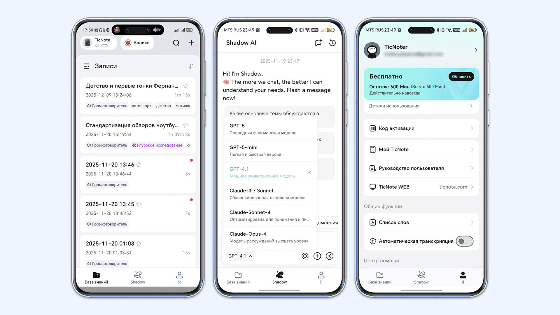 Диктофон раскрывает свой потенциал только в связке с фирменным приложением — без него он бесполезен. У самого гаджета нет динамика, поэтому слушать записи и работать с текстом придётся через смартфон или веб-версию, предварительно синхронизировав записи через смартфон. Приложение простое и интуитивное, разобраться с ним не проблема. Внутри три раздела: База знаний — все записи, Shadow — ИИ-ассистент, Я — настройки.