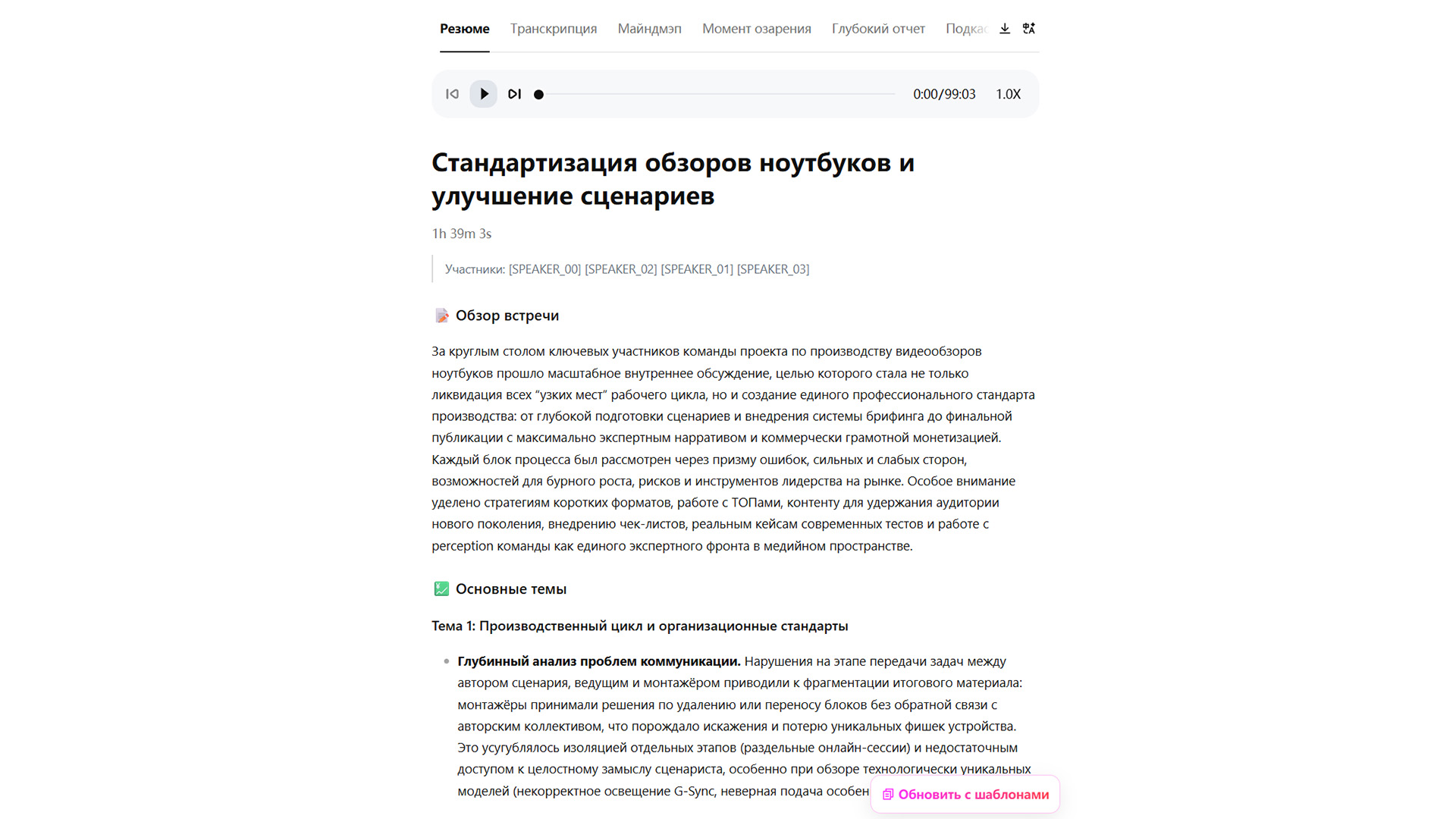 Встроенный ИИ-ассистент может резюмировать встречу, выделить ключевые моменты в разговоре. Причём Mubvoi на выбор предлагают несколько десятков шаблонов в зависимости от того, какой тип встречи был. Если это была лекция, можно выбрать соответствующий режим, интервью — тоже, даже для встречи с адвокатом есть свой шаблон. Часть из них бесплатная, а для специализированных нужна подписка, также можно создать и свой.