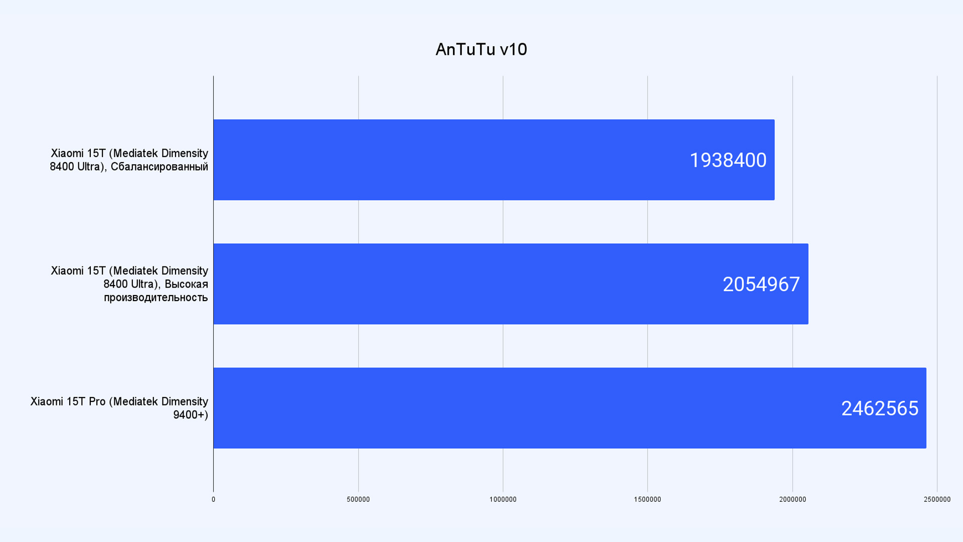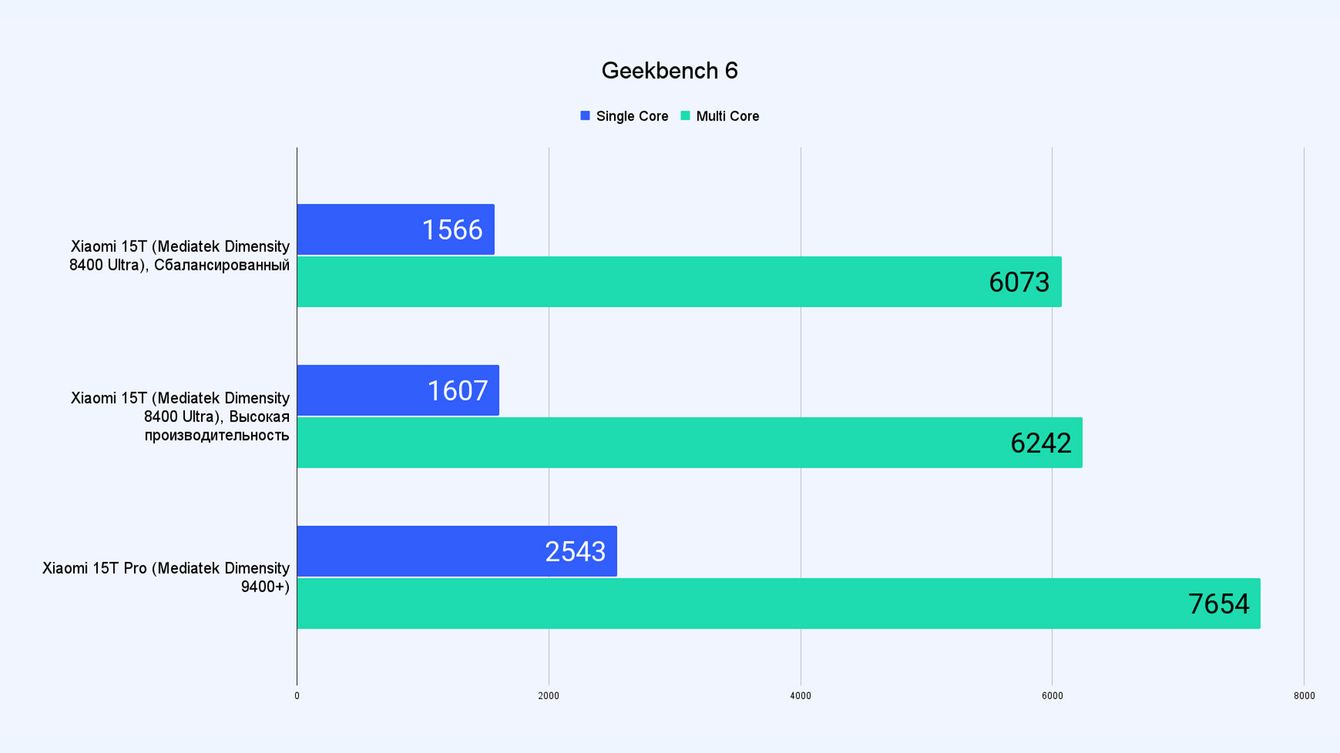 Сердце смартфона — чипсет MediaTek Dimensity 8400 Ultra (4 нм). Он слабее процессора в Pro-версии, но это ожидаемо. Бояться этого не стоит: Xiaomi 15T отрабатывает каждый вложенный рубль. По сырой мощности чип наступает на пятки прошлогодним флагманам на Snapdragon 8 Elite, набирая около 2 миллионов баллов в AnTuTu. В Geekbench результаты также достойные: 1607 (Single Core) и 6242 (Multi Core). Отставание от 15T Pro составляет 20–30% на бумаге, но в реальной жизни разница в скорости работы системы практически не ощущается.