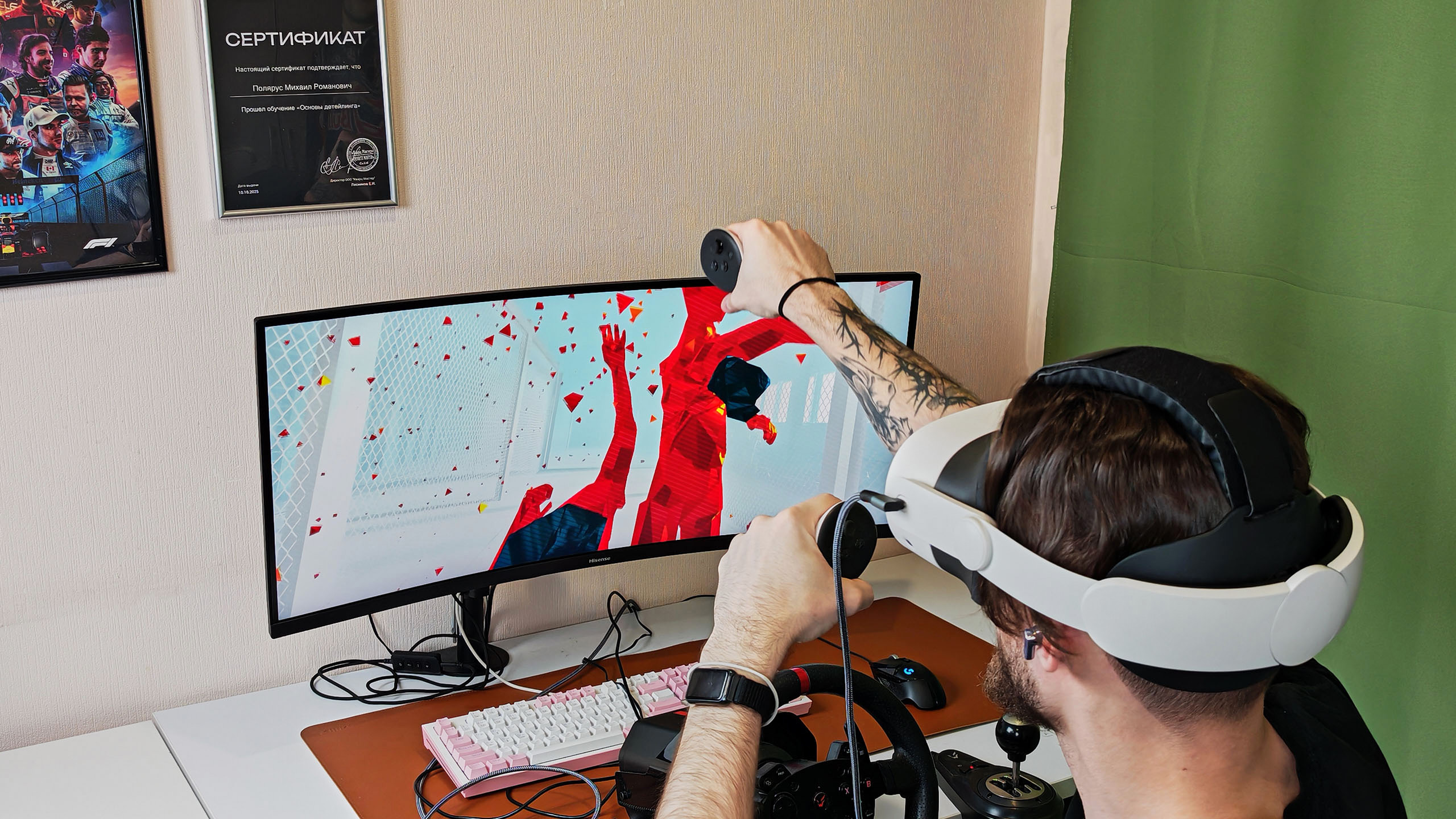 Помимо гонок, я попробовал классику VR — Superhot и Beat Saber. Это уже не про сидение в кресле, а про активное движение. Здесь я столкнулся с суровой реальностью: поясница оказалась не готова к такому интенсивному геймплею. Уворачиваться от пуль и рубить кубы под музыку весело первые 20–30 минут, но на следующее утро спина напомнила мне, что VR — это ещё и спорт.