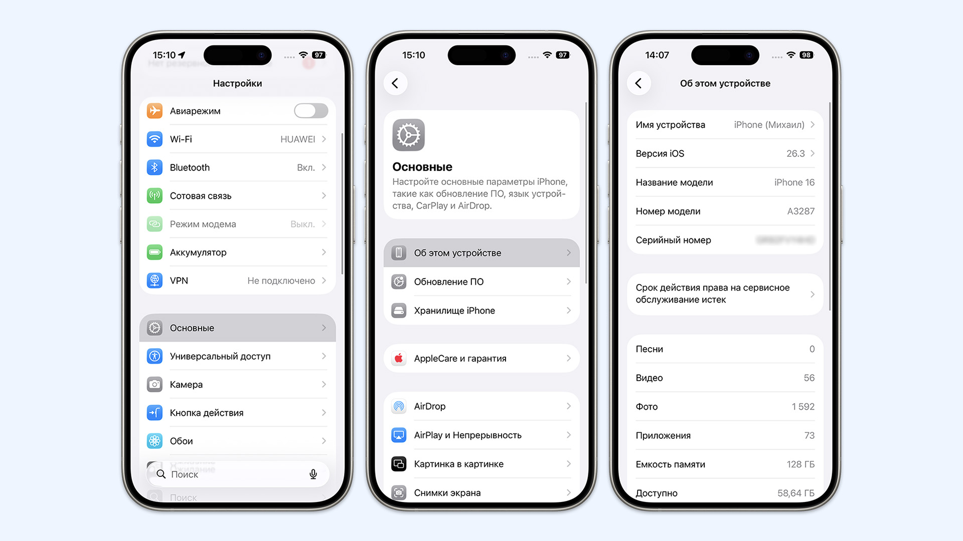 Если телефон или планшет работают, зайдите в «Настройки», выберите «Основные» и пункт «Об этом устройстве». Здесь вы увидите название модели, например iPhone 16 и её номер. Далее нажмите на строчку с номером модели, чтобы код сменился с коммерческого на технический (начинается с буквы А, например A3287). Этот индекс важен при ремонте, так как он указывает на регион поставки и прочие особенности устройства.