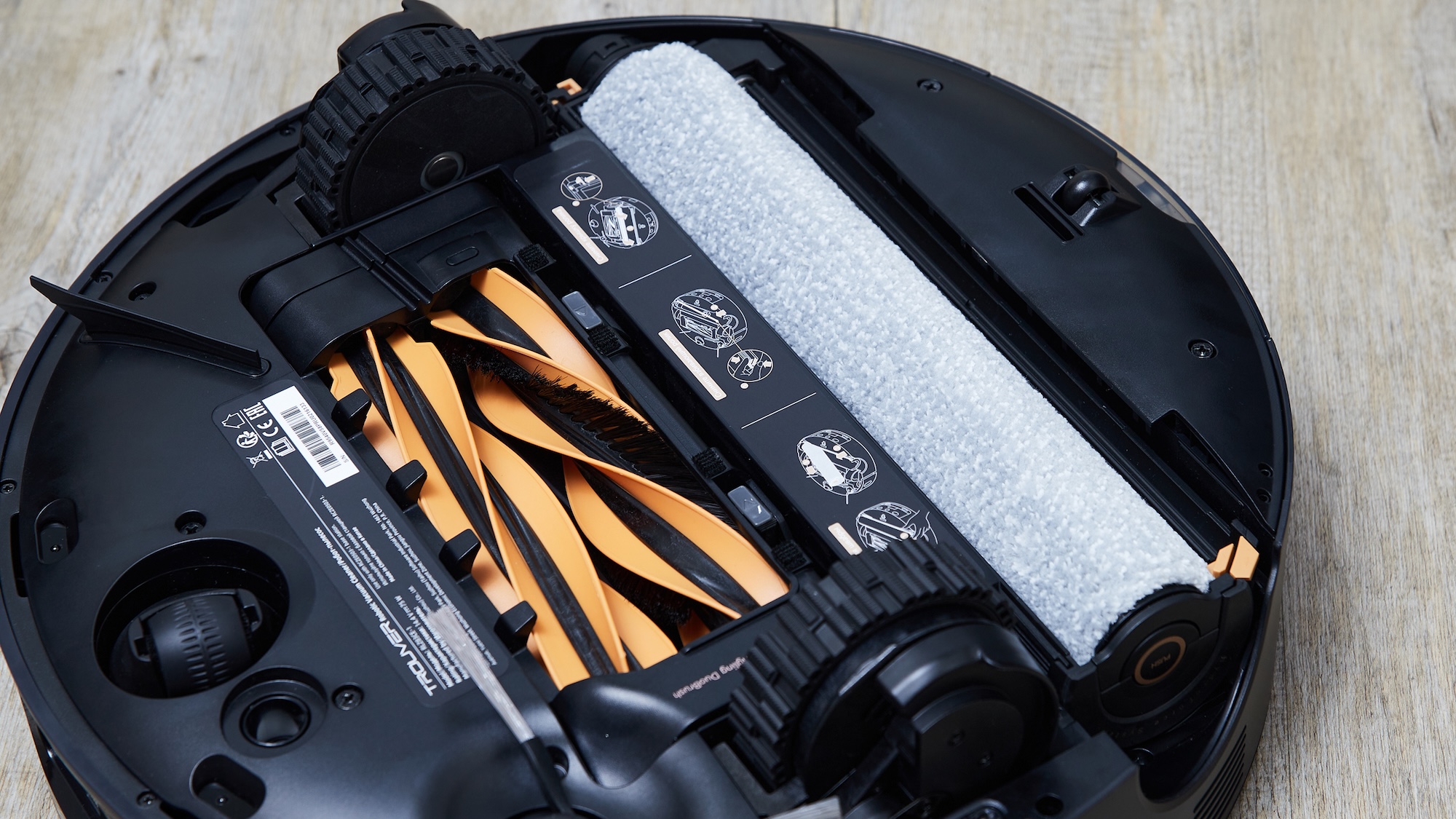 Главное отличие становится заметным, если пылесос перевернуть. Вместо двух вращающихся мопов — круглый ролик, прямо как на вертикальных пылесосах для влажной уборки. Я знаю, что такая конструкция начинает набирать популярность в роботах, но лично сталкиваюсь впервые.
