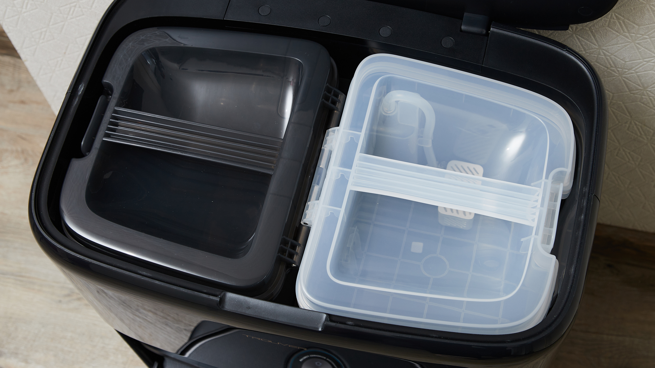 Внешне новинка напоминает Trouver V50 Ultra Complete, который побывал у нас на обзоре в прошлом году. Первое отличие, которое бросается в глаза: цвет корпуса теперь чёрный, а не белый. Выглядит очень солидно — до тех пор, пока к пылесосу не прикасаешься руками. Отпечатки остаются легко, оседающая сверху пыль тоже хорошо заметна. Я бы предпочёл, чтобы производители бытовой техники делали устройства матовыми, а не глянцевыми. Ещё позабавил серый провод питания, хотелось бы цветового единства с корпусом. Однако в целом конструкция выглядит впечатляюще — понимаешь, что перед тобой флагманская модель.