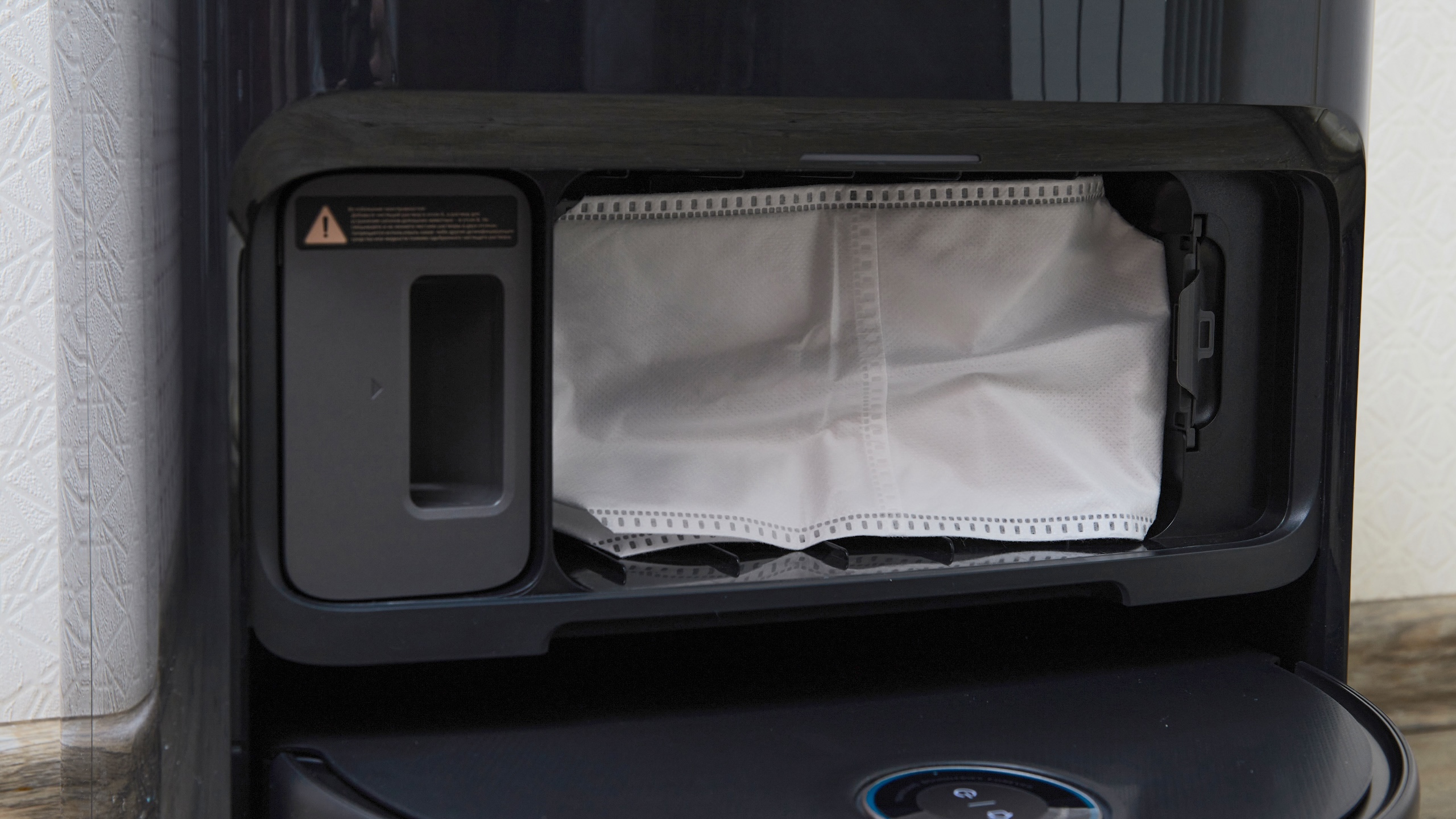 Док-станция у пылесоса крупная — значительно больше, чем в моделях бюджетного и среднего уровня. Внутри находятся два бака для воды. Ёмкости внушительные — 4 литра для чистой и 3,5 л для грязной жидкости. Это логично: пылесосы с роликом расходуют воду активнее, чем их аналоги со швабрами.