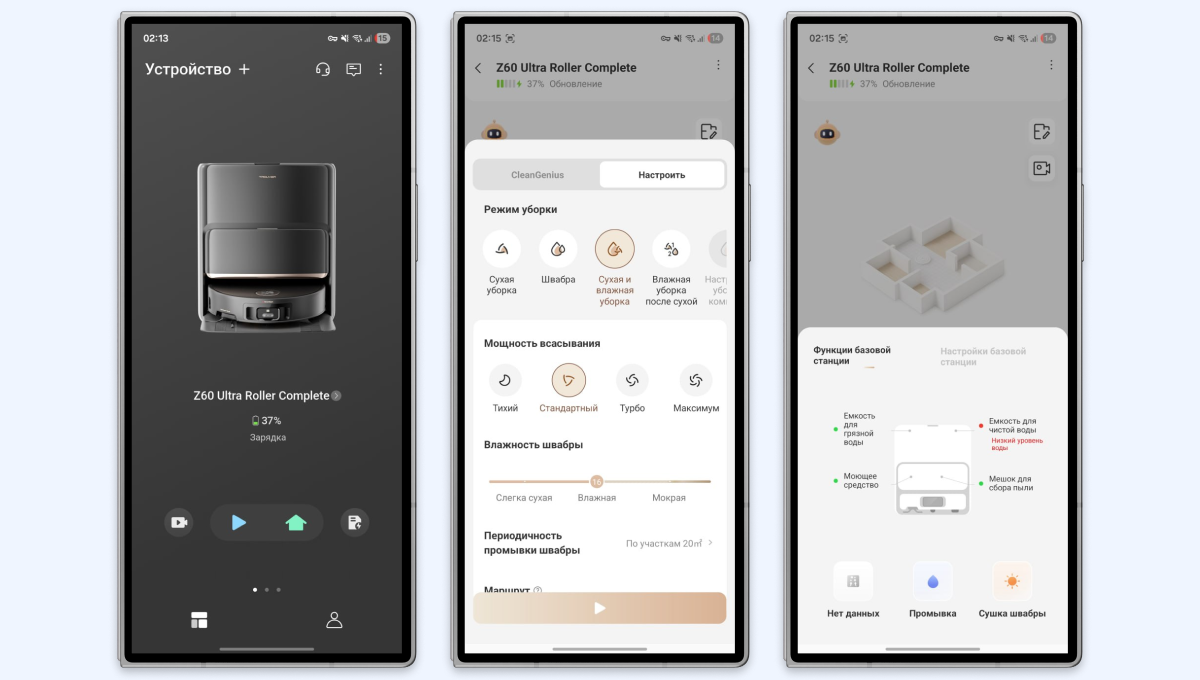 В стандартном режиме пылесос выбирает разумный компромисс между тщательностью уборки и её продолжительностью. Если запускать робота раз в 1-2 дня, стандартного режима точно хватит для поддержания чистоты в средней квартире. В настройках можно дополнительно указать режим и последовательность уборки — например, Trouver Z60 Ultra Roller Complete может выполнять сухую и влажную уборку одновременно либо поочередно. А если выбрать тщательный режим очистки, то робот может убирать квартиру более часа, зато двигаться будет очень узкими зигзагами и не спеша, уделяя повышенное внимание отдельным участкам пола. Такой режим подойдёт для удалённой очистки, когда вы не дома, или при запуске пылесоса 1-2 раза в неделю.