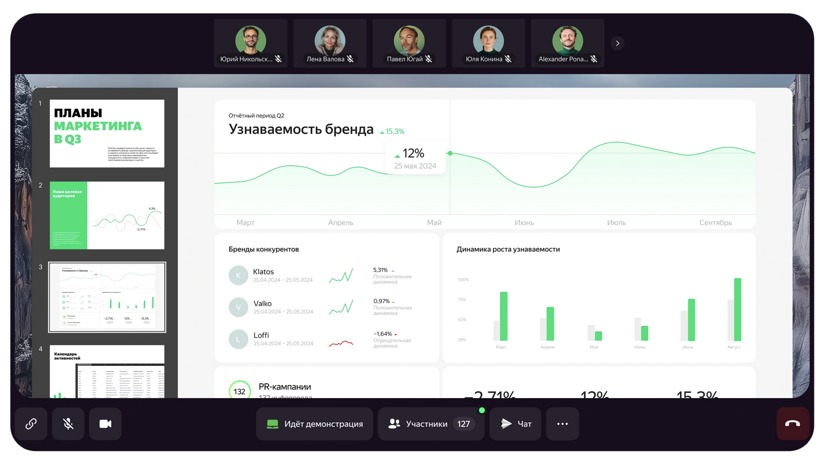 Этот российский сервис, как и SaluteJazz, может работать на разных устройствах. Для этого понадобится учётная запись Яндекса. Помимо видеосвязи, есть возможность демонстрации своего экрана в разрешении 4K, в том числе одновременно с видео самого выступающего. Это удобно для проведения презентаций: например, лектор может показывать часть материала на доске, а часть — на своём компьютере.