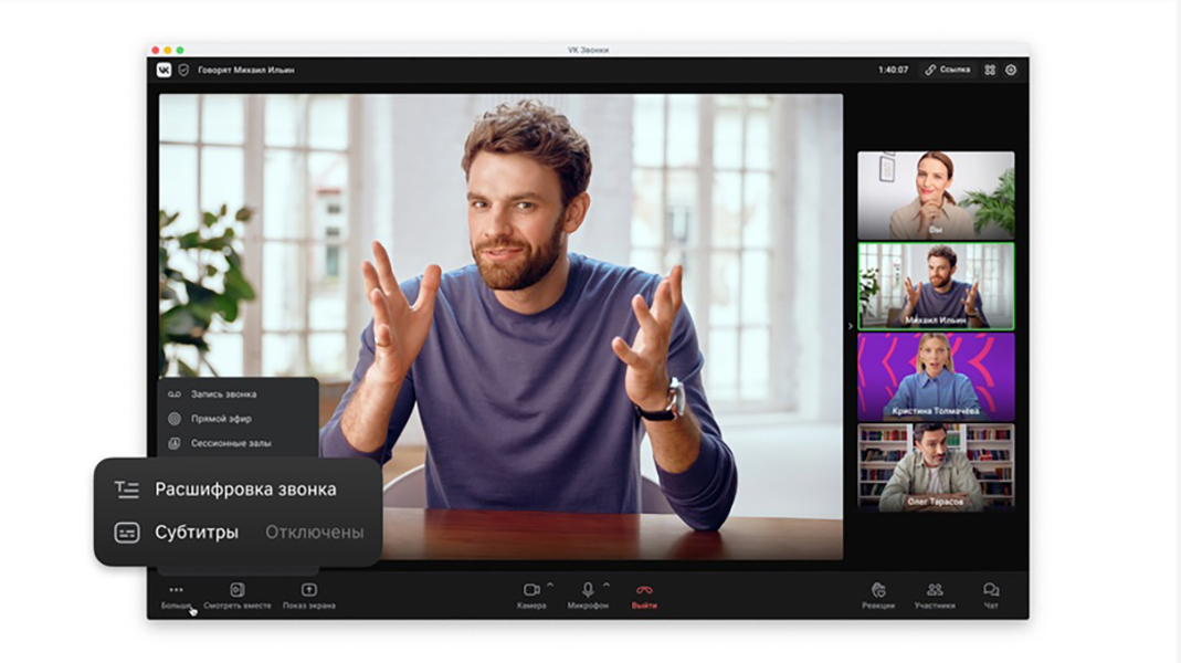 Набор функций примерно тот же, что у основных конкурентов. Есть автоматические субтитры и текстовая расшифровка разговоров, запись видео и чата, а также замена фона и даже лица на нарисованного персонажа, если говорящему неудобно «светиться» на камеру.