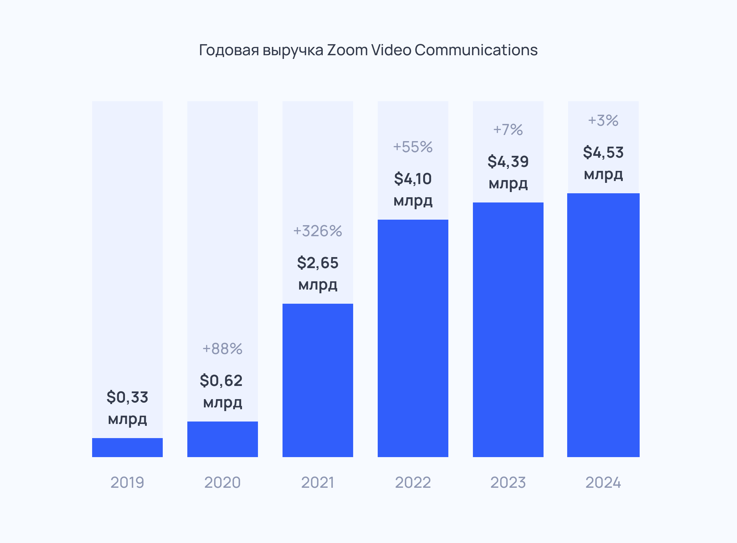 Лишь к 2023 году темпы роста доходов Zoom замедлились, но компания всё равно продолжает расти.