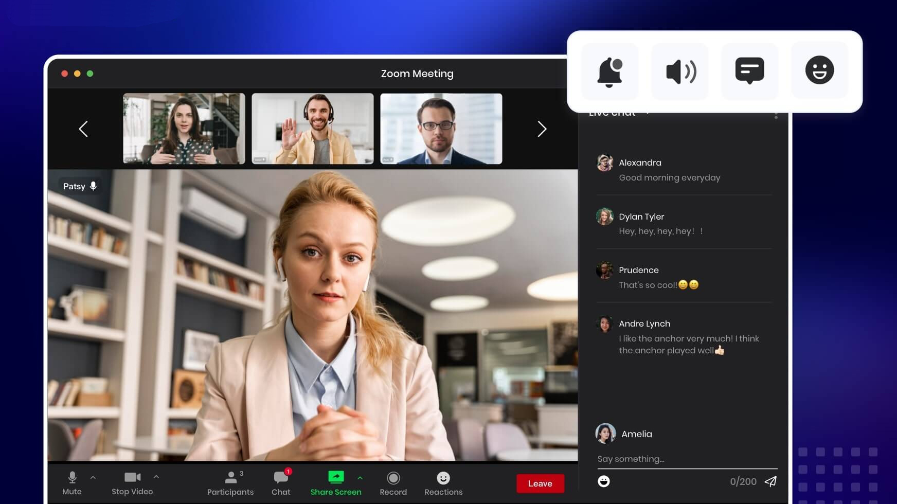 Одновременно в конференции могут участвовать до 100 человек, а отображаться на экране — до 49 человек. Чтобы привлечь внимание в групповой беседе, предусмотрена кнопка «Поднять руку». При её нажатии окно говорящего подсветится и остальные поймут, что он хочет взять слово. Ещё одна полезная особенность Zoom — функция демонстрации экрана. Она пригодится для проведения уроков и презентаций: можно просто показывать другим то, что вы делаете на своём компьютере.