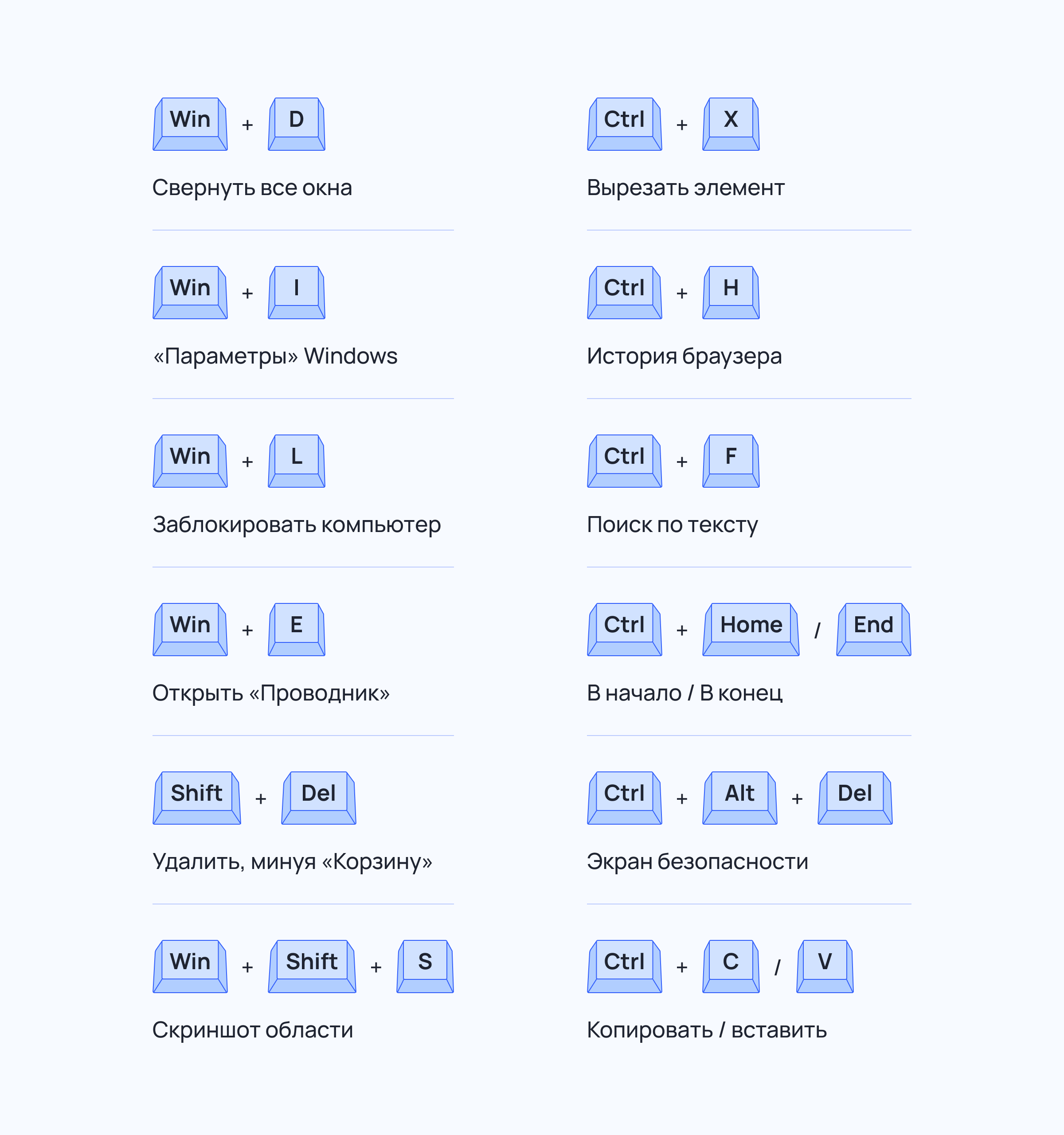 Для удобства мы подготовили наглядную картинку с комбинациями клавиш из этой статьи. Вы можете сохранить изображение у себя на ПК или распечатать его, чтобы не потерять.
