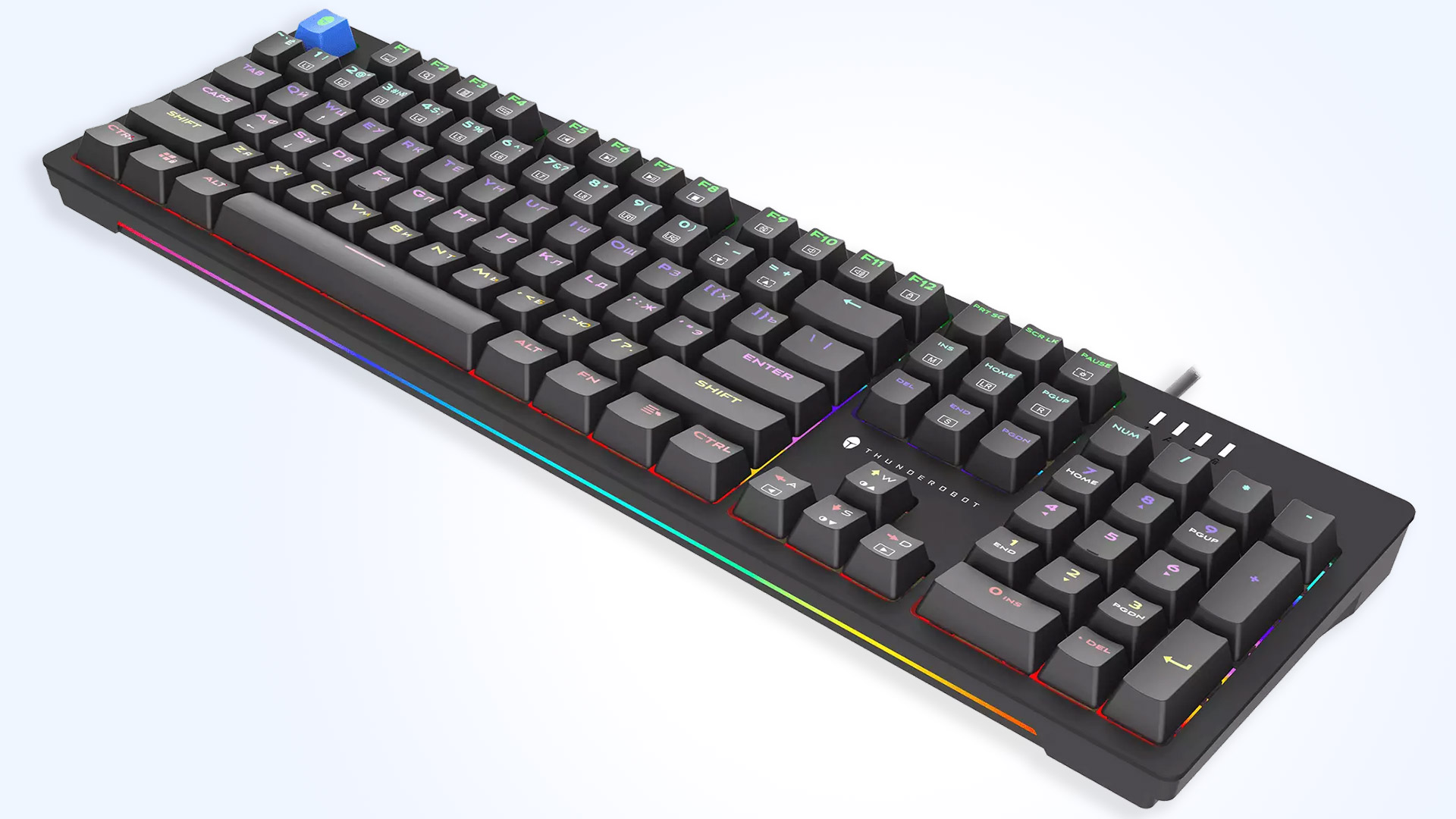 Thunderobot KG3104R — «механика» с RGB и ценником в диапазоне 3000–4000 рублей. Клавиатура выполнена в классическом 104-клавишном формате с простой и надёжной конструкцией «скелетон». У них открытая конструкция, за счёт которой клавиши закреплены прямо на подложке и не прикрыты дополнительным слоем пластика. Это облегчает чистку устройства.