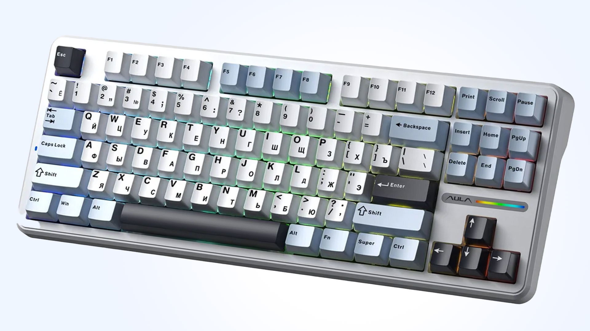 AULA F87 PRO — интересный вариант, особенно если ищете модель с лёгким ходом клавиш без тактильного отклика и щелчка. Внутри установлены переключатели Leobog Greywood V3, которые по обзорам и отзывам отличаются приятным, плавным и тихим нажатием за счёт заводской смазки. К тому же это одна из немногих беспроводных бюджетных моделей на рынке — от аккумулятора работает до 400 часов без подсветки и до 50 часов с подсветкой.