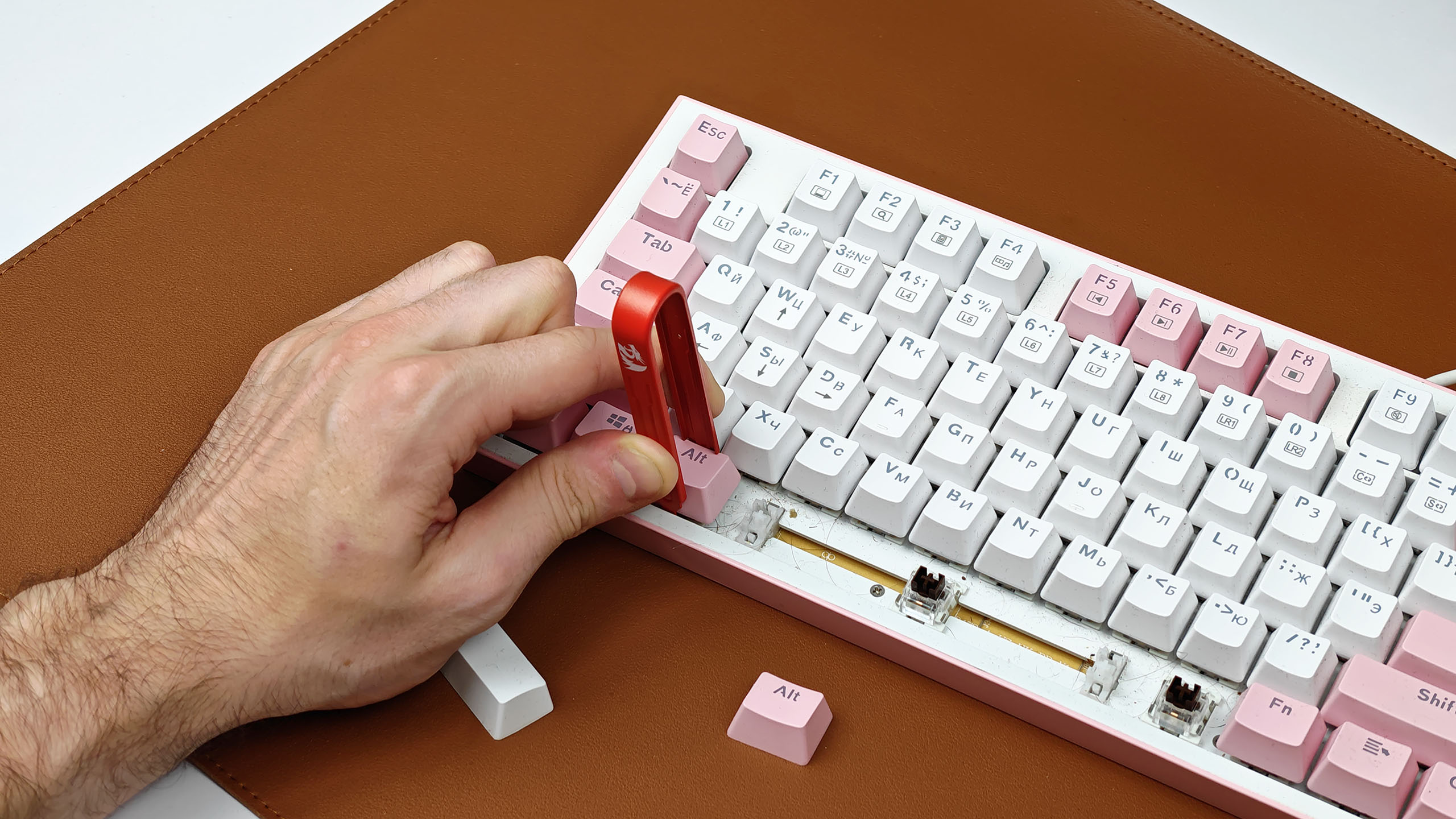 Шаг 1. Снимите кейкапы с помощью пуллера или пинцета. Особое внимание уделите длинным клавишам — Backspace, пробелу, Shift и другим. У них по бокам установлены стабилизаторы, поэтому извлекайте предельно аккуратно, чтобы не повредить их и пины крепления.