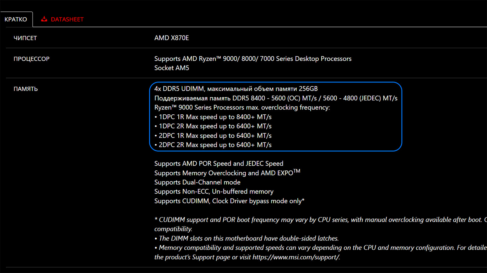 Учитывайте, что максимальный объём памяти ограничен возможностями материнской платы и процессора. Например, даже если вы купите комплект из двух модулей памяти с общим объёмом 128 Гб, но ваша материнская плата поддерживает максимум 64 Гб, то в лучшем случае системе будет доступна только половина, либо она не заработает вовсе. Проверить это можно в характеристиках на сайте производителя: введите модель материнской платы в поиске, откройте раздел «Память» (Memory Support) или «Спецификация» (Specifications) и посмотрите, какой стандарт (DDR4 или DDR5) и какой объём поддерживаются.