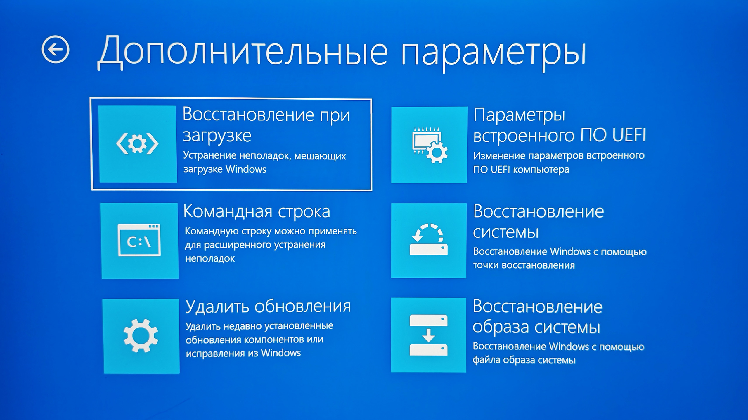 В WinRE выберите «Поиск и устранение неисправностей», затем «Дополнительные параметры». Далее выберите «Восстановление при загрузке» — это автоматический механизм, который ищет и исправляет ошибки загрузчика и повреждённые системные файлы. Дождитесь завершения операции и перезагрузите компьютер. Если автоматический режим не помог, перейдите к другим инструментам WinRE: удаление обновлений, восстановление системы или командная строка.