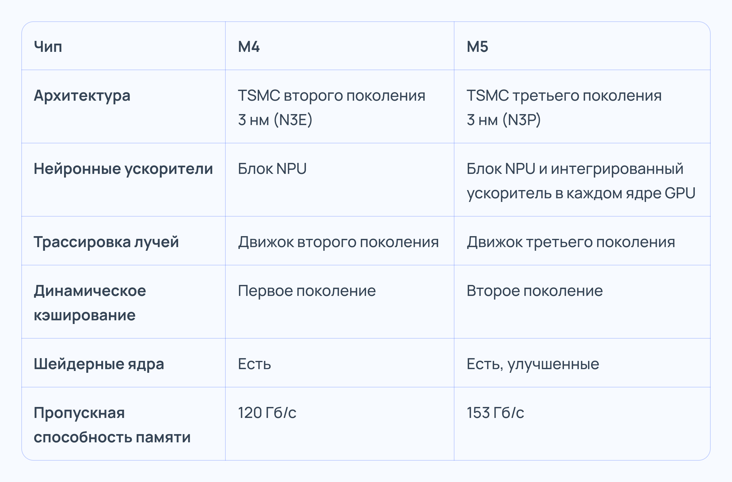 Одна из главных фишек M5 — большой скачок производительности в процессах, связанных с искусственным интеллектом и машинным обучением. Как и мобильные процессоры линейки A19 для iPhone, свежий чип оснащён новыми нейронными ускорителями для работы с ИИ, которые работают на каждом ядре графического процессора.