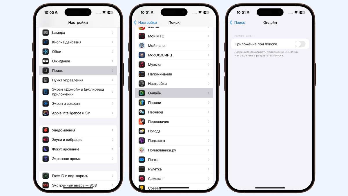 Если приложение удалено с главного экрана, то просто откройте «Библиотеку приложений» и перетащите иконку обратно. Если скрывали из поиска — повторите те же действия в обратной последовательности. А если скрывали с помощью Face ID, то откройте папку скрытых программ, выберите нужное приложение, зажмите его иконку и выберите «Не требовать Face ID».