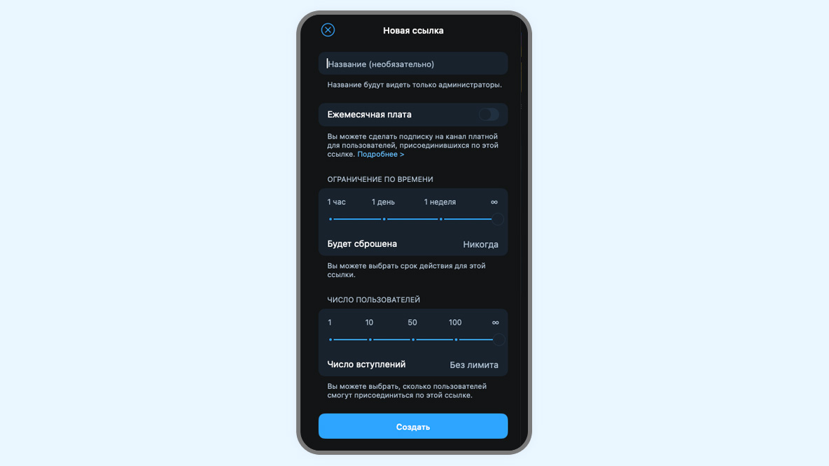 С такой возможностью бот сможет самостоятельно создавать ссылки для вступления в вашу группу или канал, а заодно настраивать их: устанавливать срок действия приглашения и ставить лимит приглашённых пользователей. Это удобные фишки, если у админа закрытое сообщество или он хочет детально отслеживать всех вступающих, например после закупки рекламы в других каналах.
