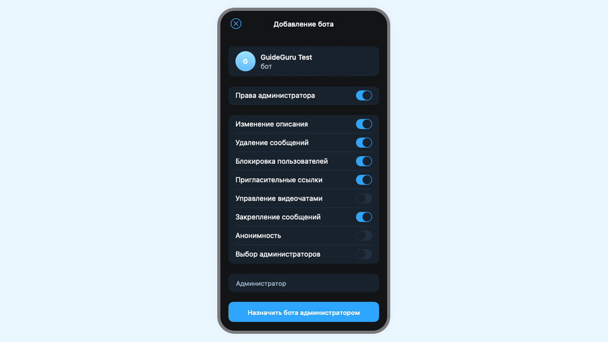 Когда владелец канала или группы добавляет бота, он наделяет его определёнными правами. Их всего восемь, и при их передаче администратор может выбрать только те, которые посчитает нужными и безопасными.