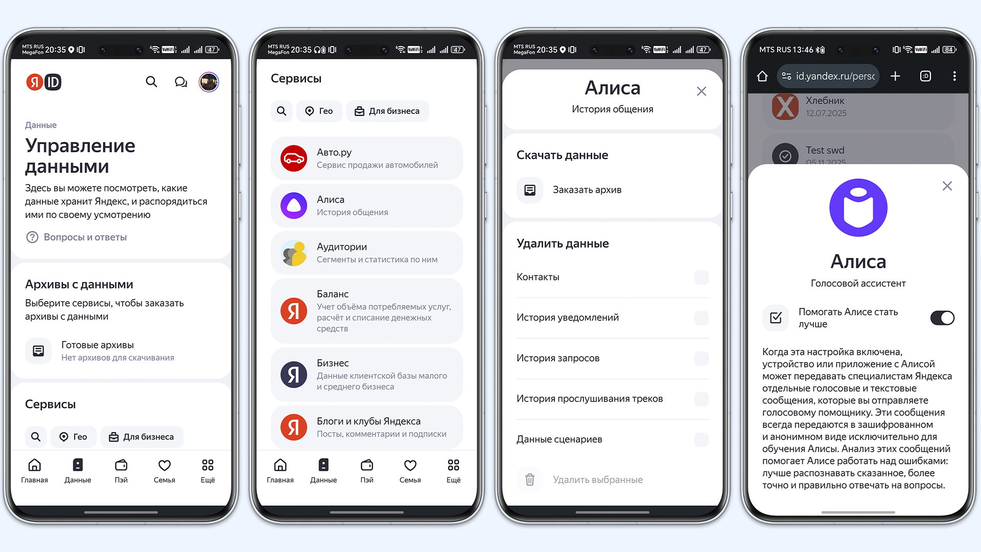 - Перейдите в «Данные» → «Доступ к данным» и отключите функцию «Помогать Алисе стать лучше».