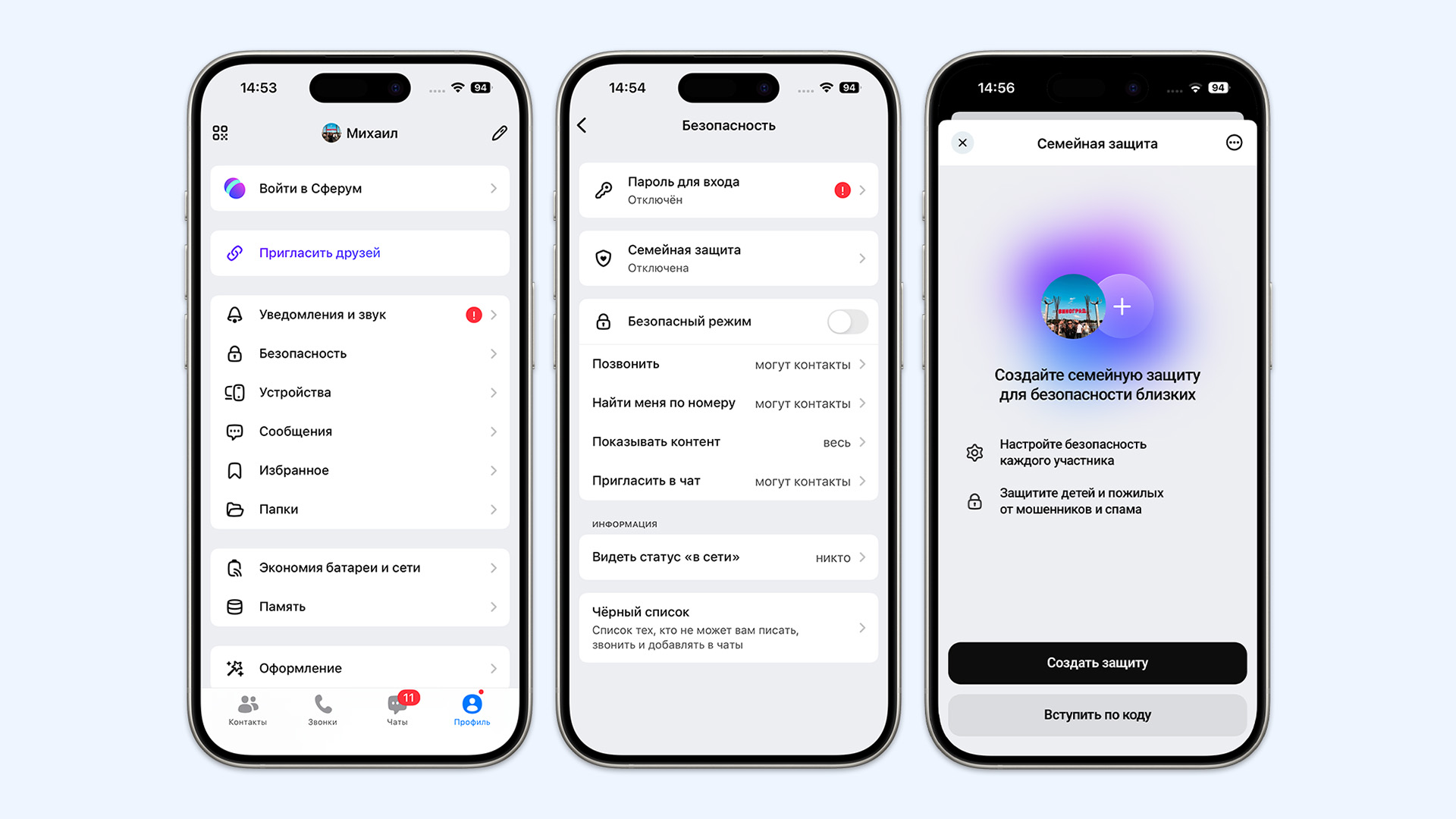 Активируйте Семейную защиту в MAX. Это новая фишка мессенджера, которая позволяет обезопасить аккаунты ваших близких. Например, если пожилому родственнику пишет контакт, помеченный системой как «потенциальный мошенник», вы получите уведомление. Также Семейная защита в MAX запрещает добавление ваших близких в подозрительные группы без подтверждения доверенного лица.