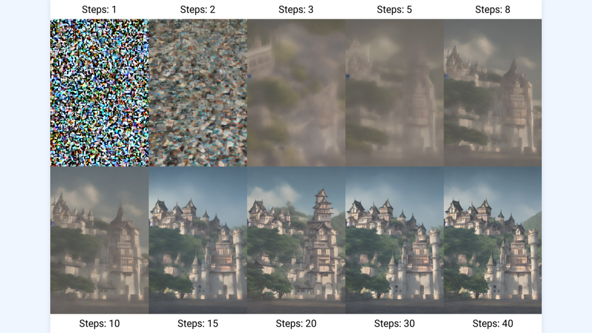 - Обратная диффузия при генерации. Когда вы даёте нейросети текстовый запрос, она начинает действовать в обратном порядке. Беря за основу холст из чистого шума, модель шаг за шагом убирает его, постепенно «проявляя» изображение, которое соответствует вашему описанию. Ваш запрос служит инструкцией, которая подсказывает алгоритму, какой именно шум нужно удалить, чтобы в итоге получилась нужная картинка.